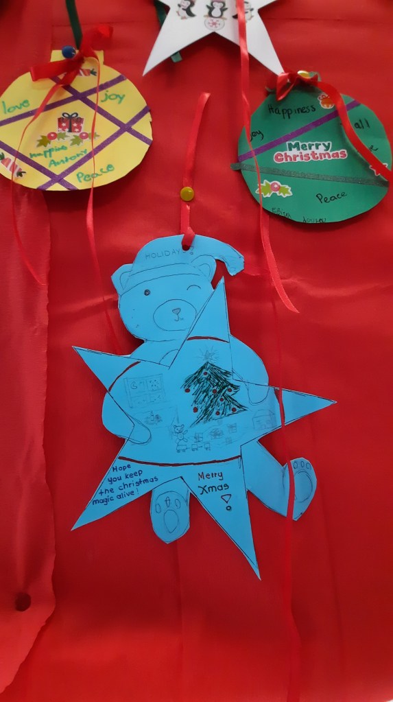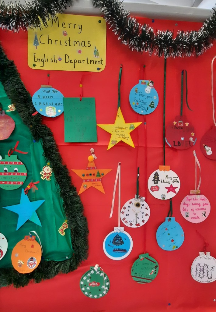 The students of grade A of our school decorated a Christmas board with their handmade ornaments crafted in their English classes sharing season wishes 🎄
