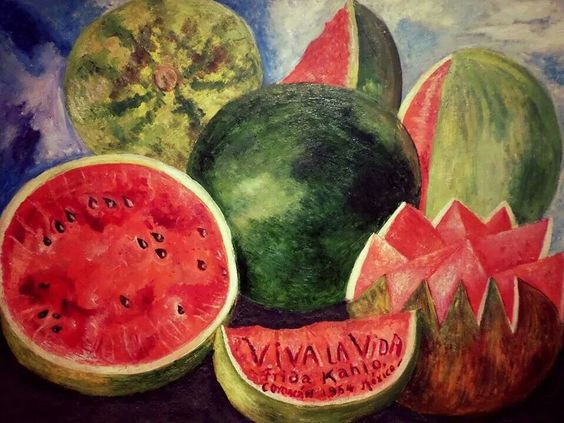 Το έργο «Viva la vida» της Frida Kahlo, ολοκληρώθηκε οκτώ μέρες πριν τον θάνατό της στις 13 Ιουλίου 1947, στα 47 της έτη. Στον πίνακα νεκρής φύσης βλέπουμε καρπούζια, ένα φρούτο που χρησιμοποιείται συχνά στο Μεξικό για να τιμήσουν την ημέρα των νεκρών ( Dia de los Muertos). Η Frida Kahlo έγραψε «Vida la Viva» στην κεντρική φέτα καρπουζιού στο κάτω μέρος του καμβά, το οποίο μεταφράζεται ως «Ζήτω η ζωή». Αυτή μπορεί να ήταν μια απλή δήλωση, καθώς ένιωθε πως πλησίαζε στον θάνατο. Μπορεί, όμως, να ήταν ένα ειρωνικό σχόλιο για τη γεμάτη πόνο ύπαρξή της, λόγω πολιομυελίτιδας, ατυχήματος σε λεωφορείο και πολλαπλών χειρουργικών επεμβάσεων.