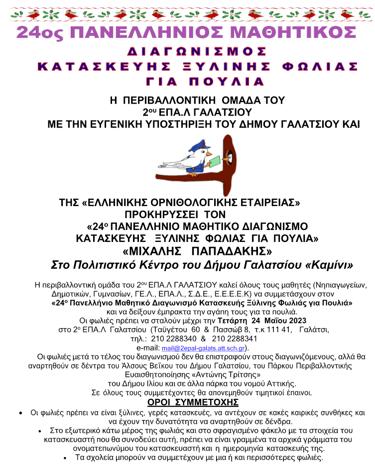 Οργανώνεται από το 2ο ΕΠΑ.Λ. Γαλατσίου, με την υποστήριξη του Δήμου Γαλατσίου και της Ελληνικής Ορνιθολογικής Εταιρείας, στο πλαίσιο εκπόνησης προγραμμάτων Περιβαλλοντικής Αγωγής, για το σχολικό έτος 2022-2023.