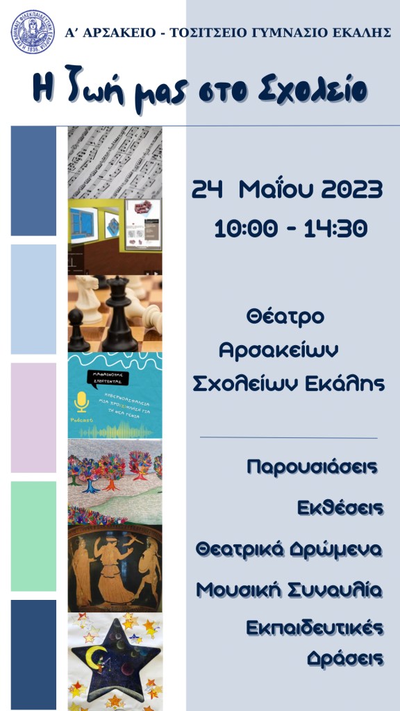 Στις 24 Μαΐου 2023 το Α’ Αρσάκειο- Τοσίτσειο Γυμνάσιο Εκάλης διοργάνωσε εκδήλωση στο Θέατρο του σχολείου μας με τίτλο «Η ζωή μας στο Σχολείο». Οι μαθητές όλων των τάξεων παρακολούθησαν και παρουσίασαν δράσεις και δημιουργικές δραστηριότητες, στις οποίες συμμετείχαν κατά τη διάρκεια της σχολικής χρονιάς 2022-2023.