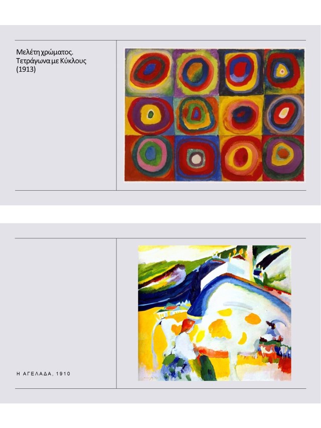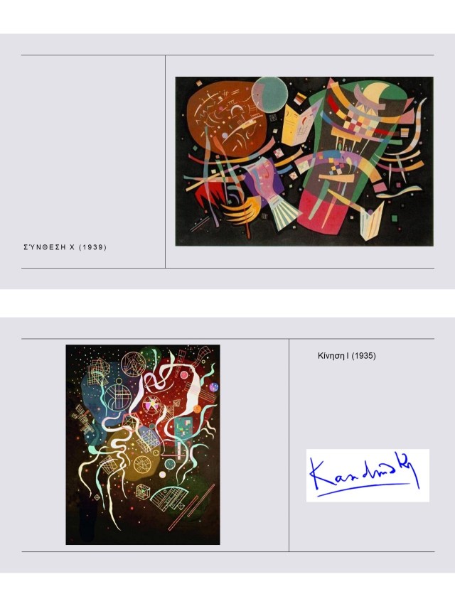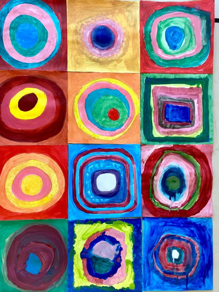 Πιο συγκεκριμένα το πρώτο έργο των μαθητών είναι αφιερωμένο στον μεγάλο εικαστικό καλλιτέχνη Βασίλι Καντίνσκι και στο έργο: «Μελέτη χρώματος. Τετράγωνα με Κύκλους», 1913. Αυτό το έργο δεν επιλέχθηκε τυχαία αφού κοσμεί και το ιστολόγιο του Σχολείου μας «μαθητική παρουσία«.