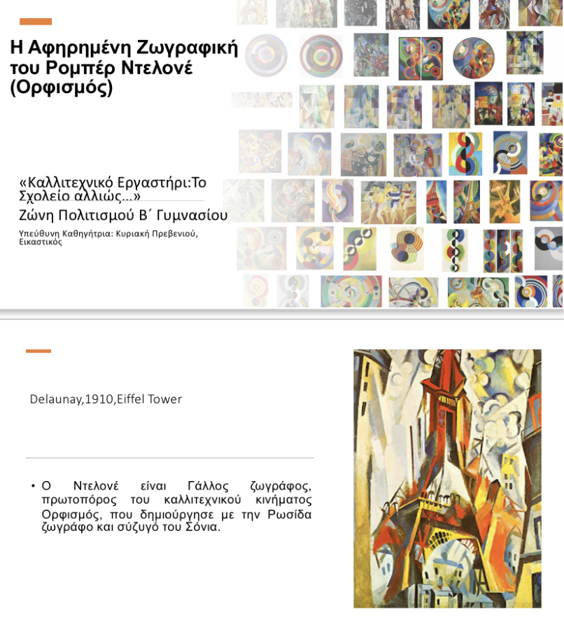 Οι μαθητές της Ζώνης Πολιτισμού της Β’ Γυμνασίου με τίτλο: «Καλλιτεχνικό εργαστήρι: Το Σχολείο αλλιώς…», ολοκλήρωσαν το δεύτερο ομαδικό τους έργο. Πιο συγκεκριμένα το δεύτερο έργο των μαθητών είναι αφιερωμένο στον μεγάλο εικαστικό καλλιτέχνη Ρομπέρ Ντελονέ και στο έργο «Ρυθμός», 1912. Αυτό το έργο επιλέχθηκε για τα χρώματα και τους γεωμετρικούς ρυθμούς που ακολουθεί.