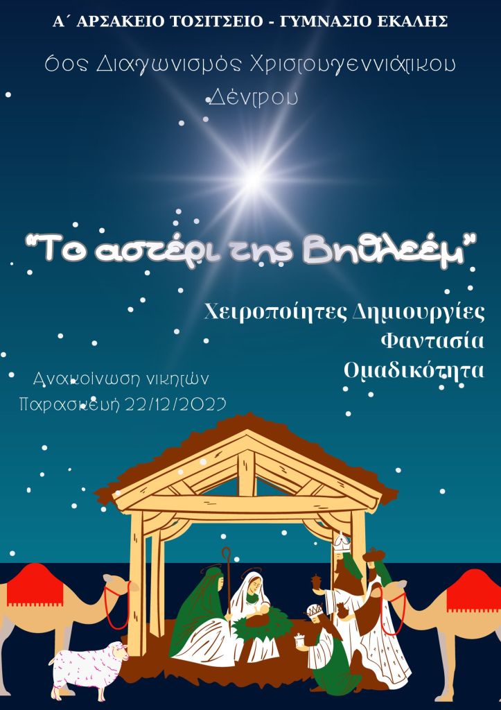 Ο 6ος Διαγωνισμός Χριστουγεννιάτικου Δέντρου τη φετινή χρονιά έχει θέμα «Το αστέρι της Βηθλεέμ». Ο διαγωνισμός μας στοχεύει στη δημιουργία χειροποίητων στολιδιών και δημιουργιών των μαθητών για το δέντρο και την αίθουσά τους και στην καλλιέργεια της συνεργασίας και του ομαδικού πνεύματος! Την Παρασκευή 23/12/2023 η κριτική επιτροπή αποτελούμενη από καθηγητές και μαθητές θα αξιολογήσει τον στολισμό της κάθε τάξης. Καλή επιτυχία σε όλους!