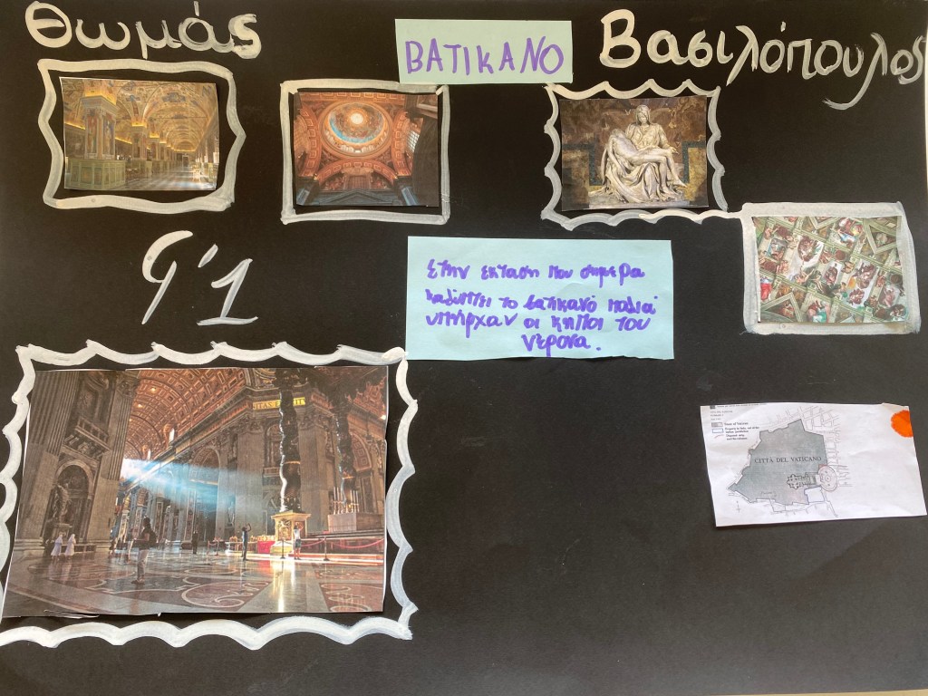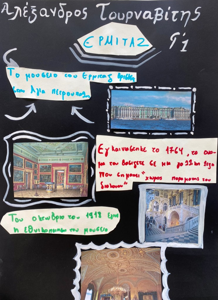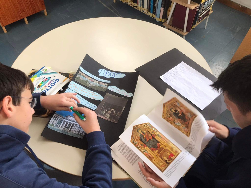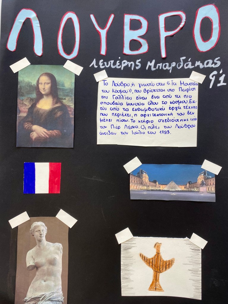 Μέσα από ένα πρωτότυπο ταξίδι αναζήτησης οι μαθητές με την καθοδήγηση της καθηγήτριας Καλλιτεχνικών κ. Κυριακής Πρεβενιού μελέτησαν στη Βιβλιοθήκη του Σχολείου βιβλία και λευκώματα για τα μεγάλα μουσεία του κόσμου, κατέγραψαν πληροφορίες και ζωγράφισαν το έργο που τους έκανε εντύπωση από το μουσείο που τους δόθηκε.