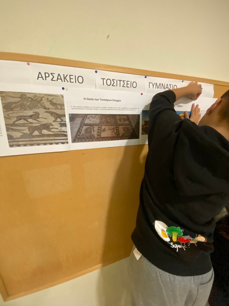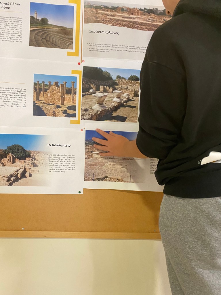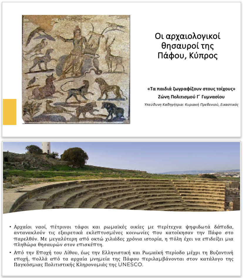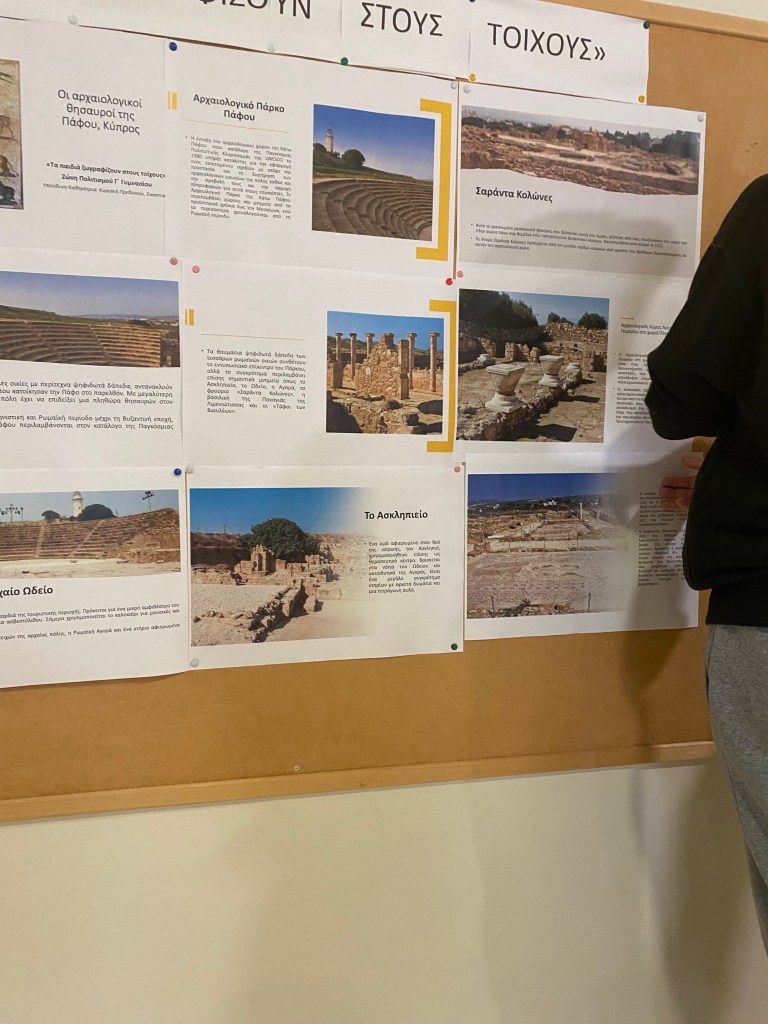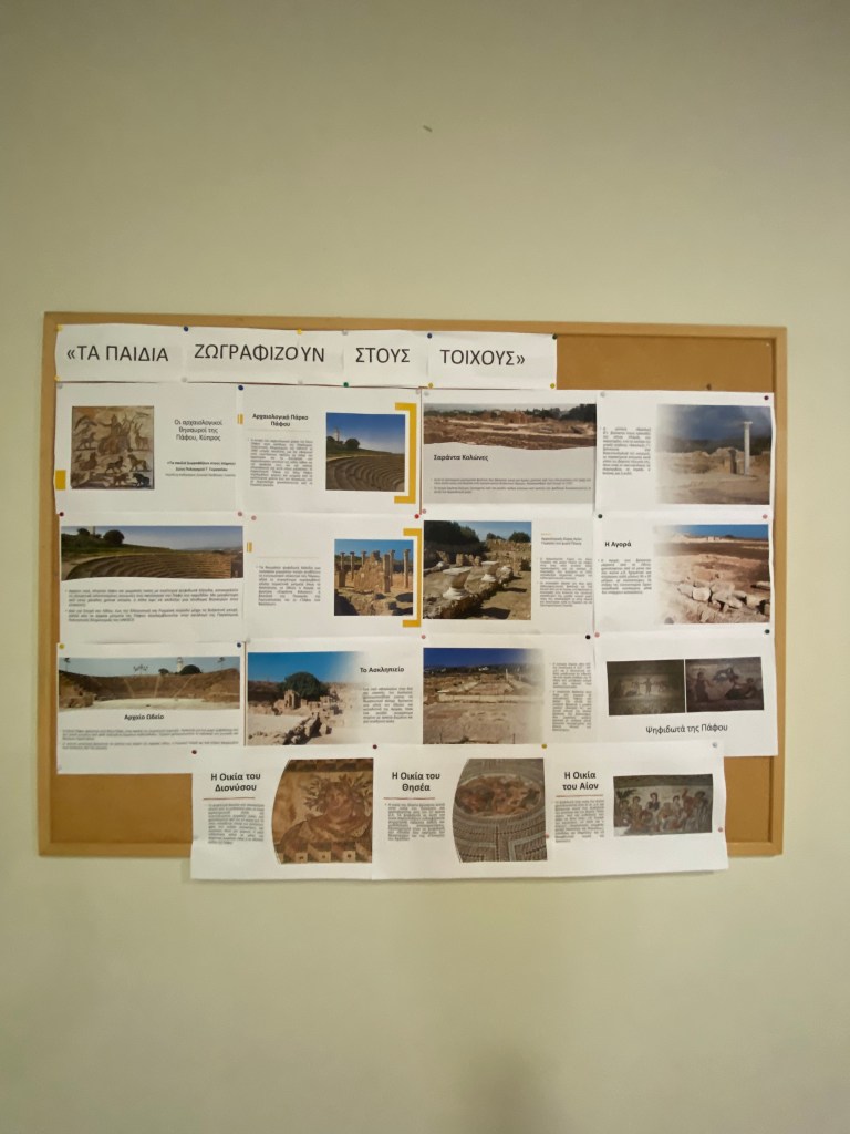Με αφορμή αυτό το ψηφιδωτό του Ορφέα, οι μαθητές ανάρτησαν στον χώρο της τοιχογραφίας μια παρουσίαση των αρχαιολογικών θησαυρών της Πάφου. Φωτογραφίες από τα πολύτιμα αρχαιολογικά ευρήματα παρουσιάζονται μαζί με χρήσιμες πληροφορίες και μας ξεναγούν στην όμορφη Πάφο της Κύπρου.