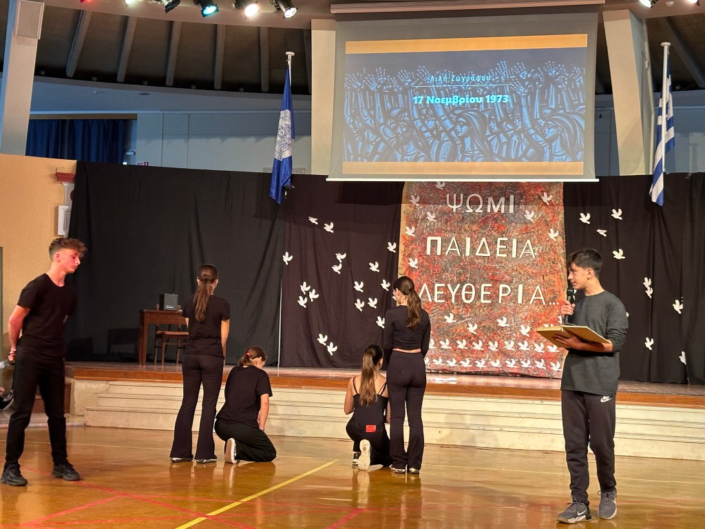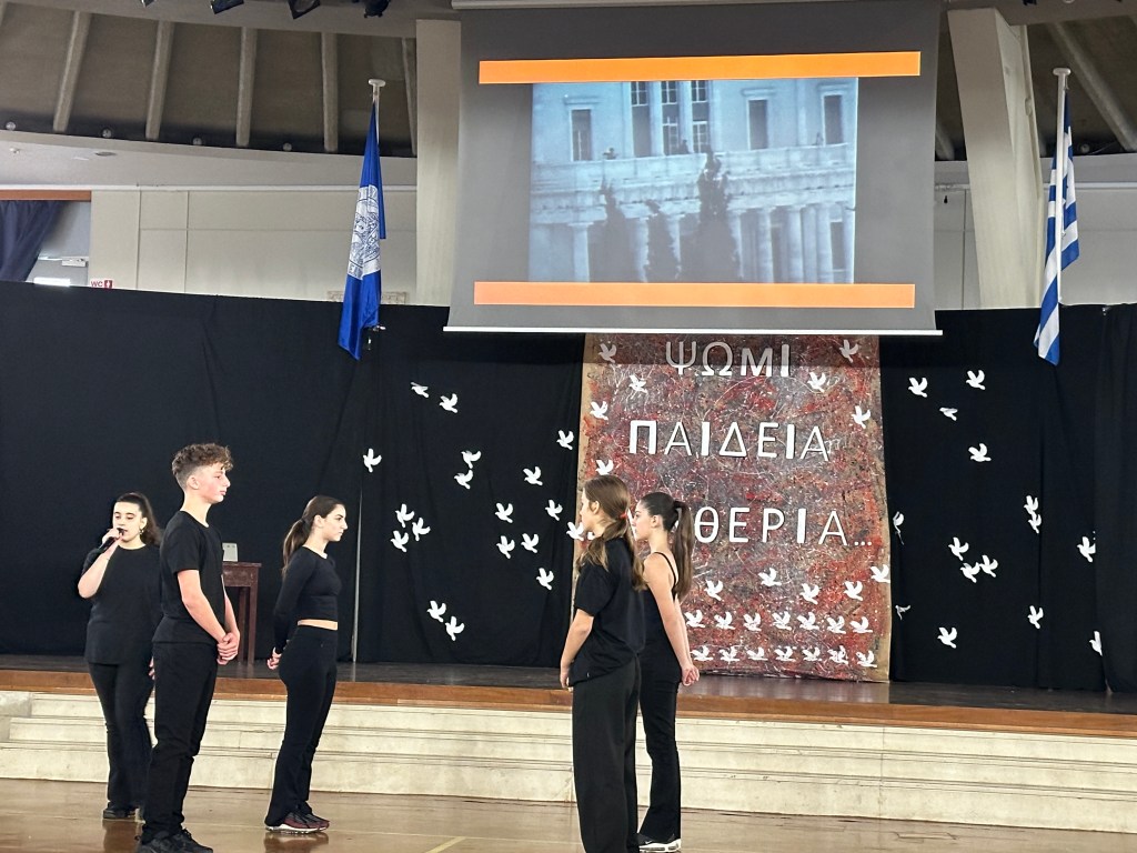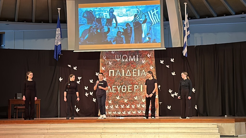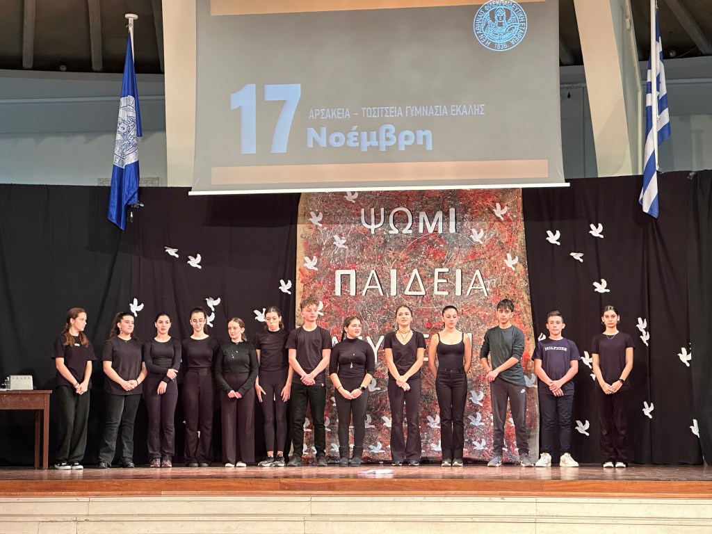 Την Παρασκευή 17 Νοεμβρίου 2023 οι μαθητές των A’ και Β’ Αρσακείων-Τοσιτσείων Γυμνασίων Εκάλης παρακολούθησαν τον εορτασμό για την επέτειο της εξέγερσης των φοιτητών του Πολυτεχνείου το 1973. Μαθητές και των δύο Γυμνασίων παρουσίασαν το χρονικό των ημερών μέσα από λογοτεχνικά κείμενα και τεκμήρια της περιόδου, τα οποία αποτύπωναν τη στάση των λογοτεχνών απέναντι στο δικτατορικό καθεστώς, ενώ η θεατρική ομάδα πλαισιώθηκε με τραγούδια σημαντικών μουσικοσυνθετών της εποχής. Μέσα από μια λιτή αλλά περιεκτική προβολή των γεγονότων που οδήγησαν στην εξέγερση, καθώς και των συνεπειών της, δόθηκε η δυνατότητα σε όλους τους παρευρισκόμενους είτε να θυμηθούν είτε να γνωρίσουν την ένταση εκείνων των ημερών.