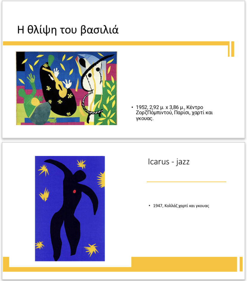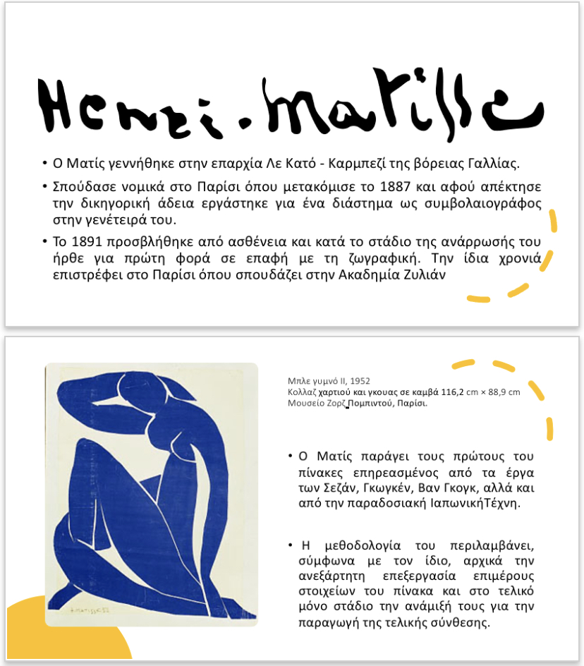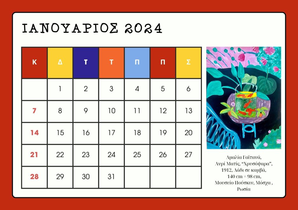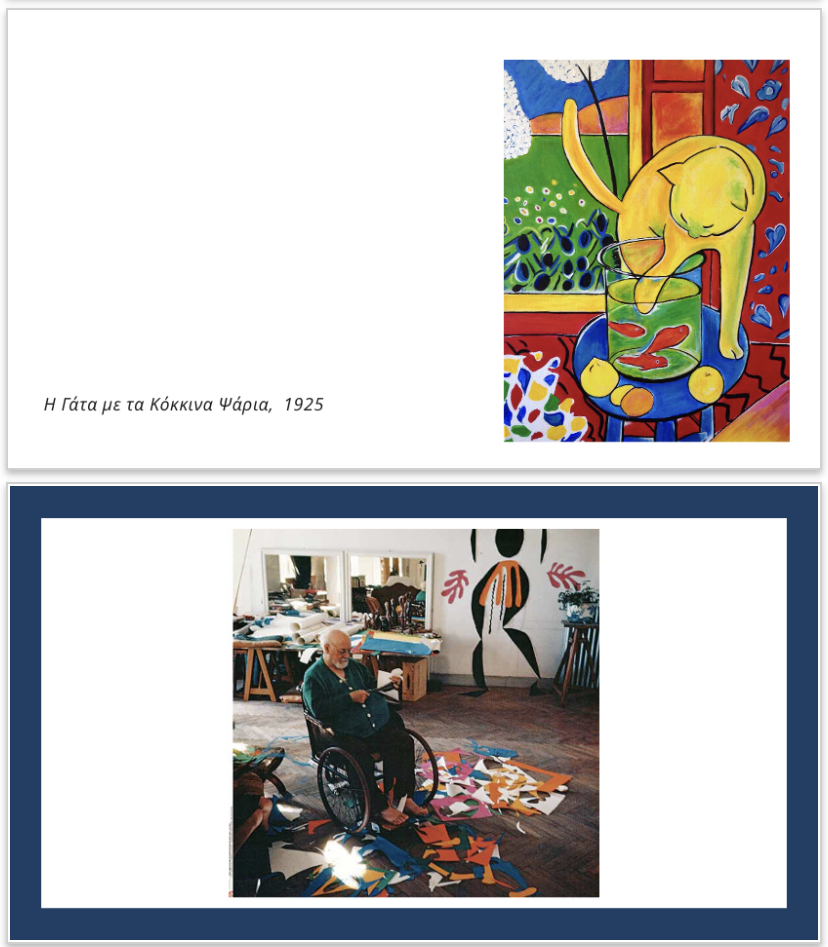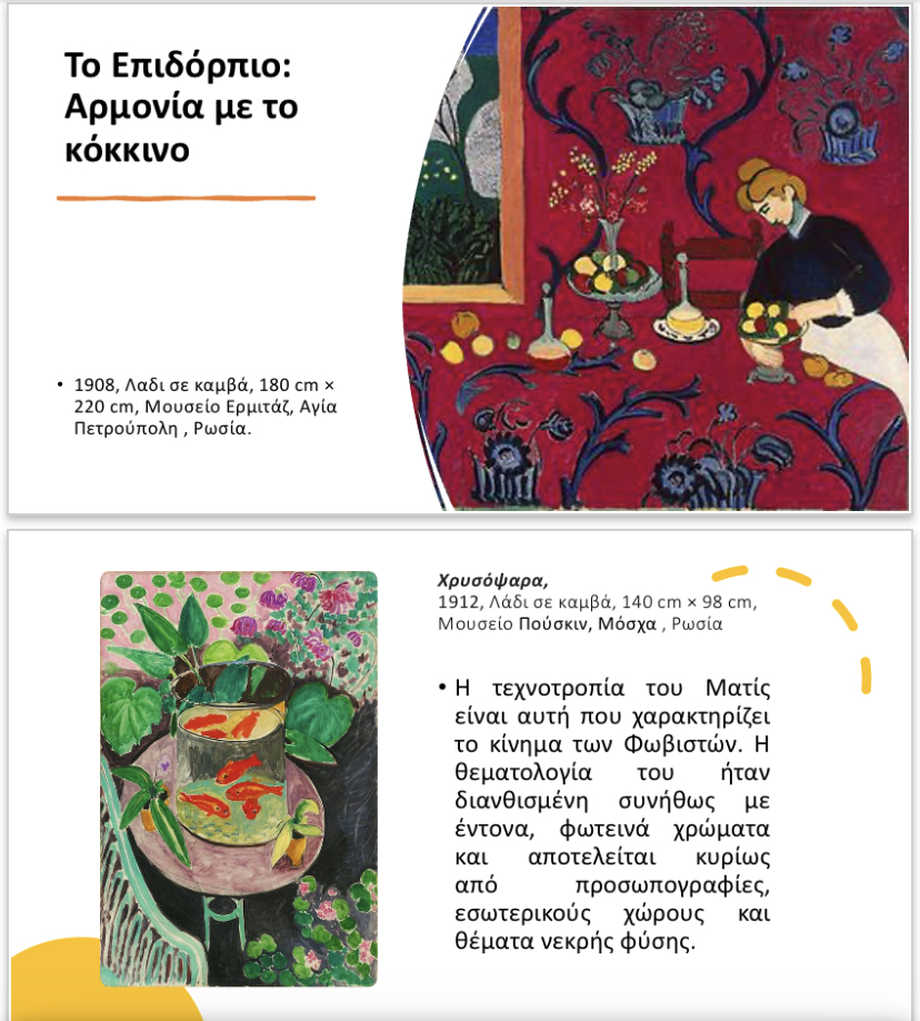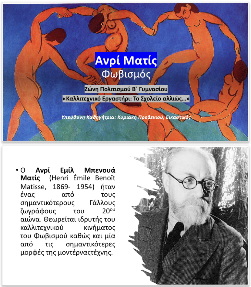 Ο κύριος εμπνευστής της, ο Ανρί Ματίς, στο τέλος του 19ου αιώνα, κατάφερε να δημιουργήσει ένα ιδίωμα ουσιαστικώς αυτόνομο και νέο, για να πετύχει τους στόχους του στην τέχνη. Οι μαθητές, αφού παρακολούθησαν προβολή παρουσίασης αφιερωμένη στη ζωή και το έργο του μεγάλου εικαστικού, με την καθοδήγηση της καθηγήτριας Καλλιτεχνικών κ. Κ. Πρεβενιού, ζωγράφισαν με ακρυλικά χρώματα και κολάζ από ένα διάσημο έργο του Ανρί Ματίς. Έπειτα με τα έργα που έφτιαξαν, δημιούργησαν ένα πρωτότυπο ψηφιακό πολύχρωμο ημερολόγιο για το έτος 2024!