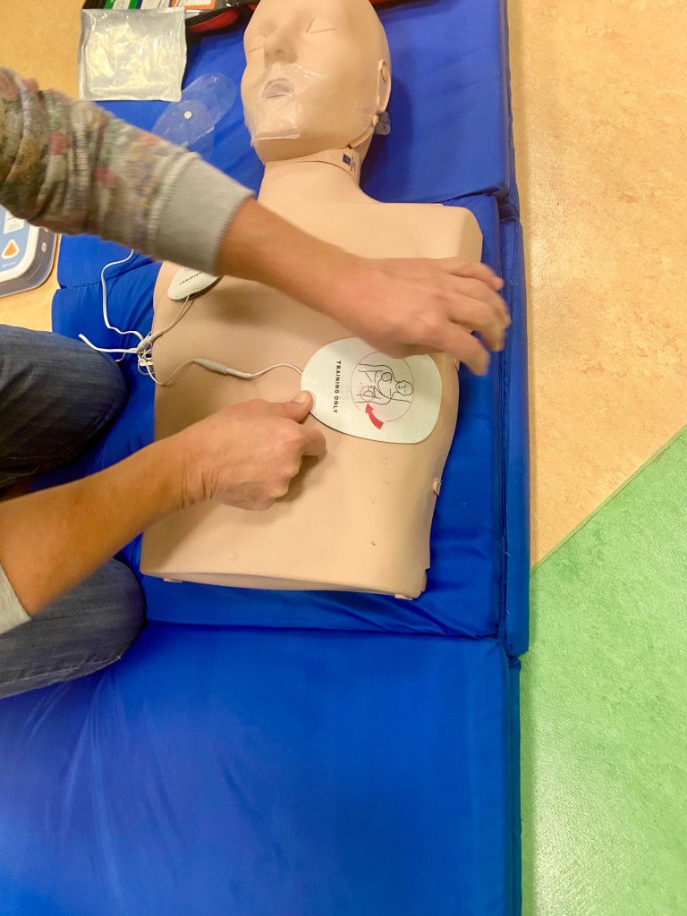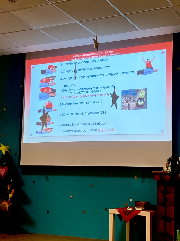 Υλοποιήθηκε από πιστοποιημένη Εκπαιδεύτρια του Ελληνικού Ερυθρού Σταυρού με ειδικότητα “ΕΚΠΑΙΔΕΥΤΗ ΠΡΩΤΩΝ ΒΟΗΘΕΙΩΝ και CPR/AED”, με ύλη προσαρμοσμένη, εναρμονισμένη και σύμφωνη με τις τελευταίες οδηγίες του Ευρωπαϊκού Συμβουλίου Αναζωογόνησης (ERC). Πραγματοποιήθηκε θεωρητική και πρακτική εξάσκηση στην Καρδιοαναπνευστική Αναζωογόνηση και τη χρήση Αυτόματου Εξωτερικού Απινιδιστή σε εξειδικευμένα προπλάσματα και εκπαιδευτικούς απινιδιστές.