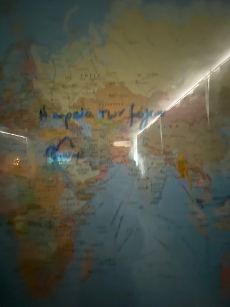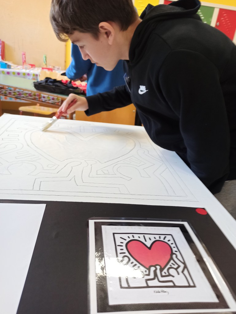 Οι μαθητές, αφού έβαλαν κόλλα στο έργο του Κιθ Χάρινγκ, δημιούργησαν κόκκινες και μαύρες μπαλίτσες από γκοφρέ χαρτί και τις κόλλησαν όλοι μαζί σε μια μεγάλη καρδιά που κρατούν δυο ανθρωπάκια. Η καρδιά συμβολίζει την αγάπη και τα ανθρωπάκια τα δύο Σχολεία που συνεργάστηκαν και δημιούργησαν ένα τόσο ωραίο έργο.