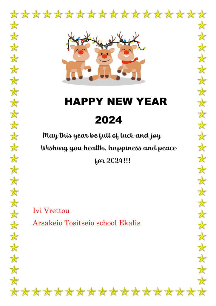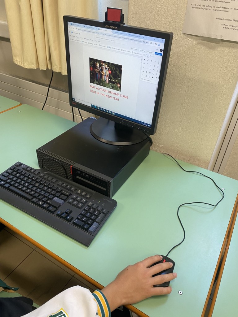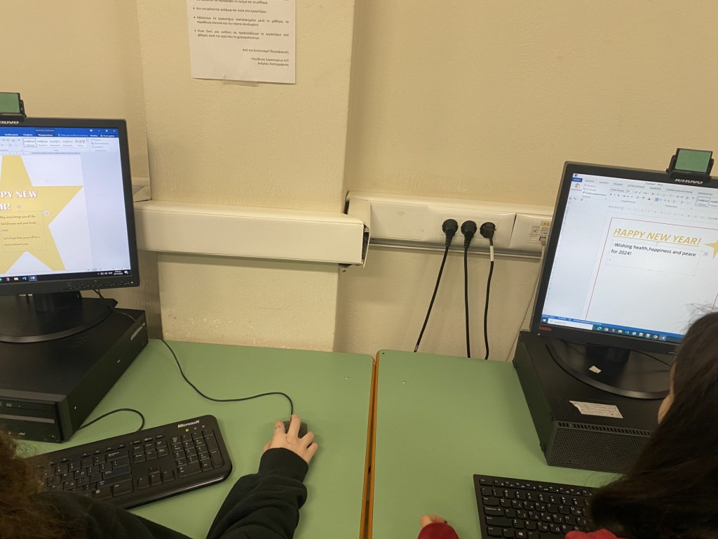 Στο πλαίσιο του προγράμματος E-twinning για το έργο “Let’s fight for a better world”, οι μαθητές της Γ’ Γυμνασίου του σχολείου μας σχεδίασαν ψηφιακά στο εργαστήριο πληροφορικής τις δικές τους ευχετήριες κάρτες για το νέο έτος, στέλνοντας τις ευχές τους στα αγγλικά. Τις κάρτες μοιράστηκαν με τους συνομήλικους μαθητές άλλων χωρών με τους οποίους συνεργάζονται στο έργο και οι δημιουργίες τους αναρτήθηκαν σε κοινό padlet.