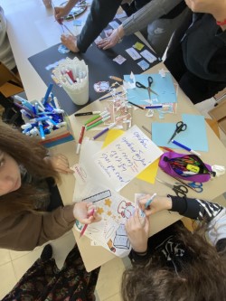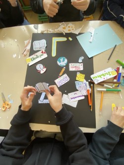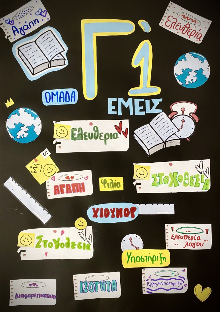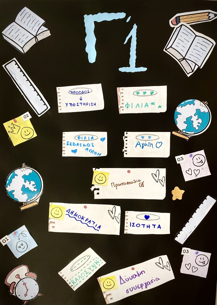 Στο πλαίσιο της δράσης οι μαθητές και οι μαθήτριες του Γ1, με την καθοδήγηση της κ. Κούρτη και με την πολύτιμη βοήθεια της καθηγήτριας Καλλιτεχνικών του Σχολείου κ. Κ. Πρεβενιού, κατασκεύασαν – δουλεύοντας ομαδικά – αφίσες και κολάζ με τις αξίες και τους στόχους τις τάξης τους.