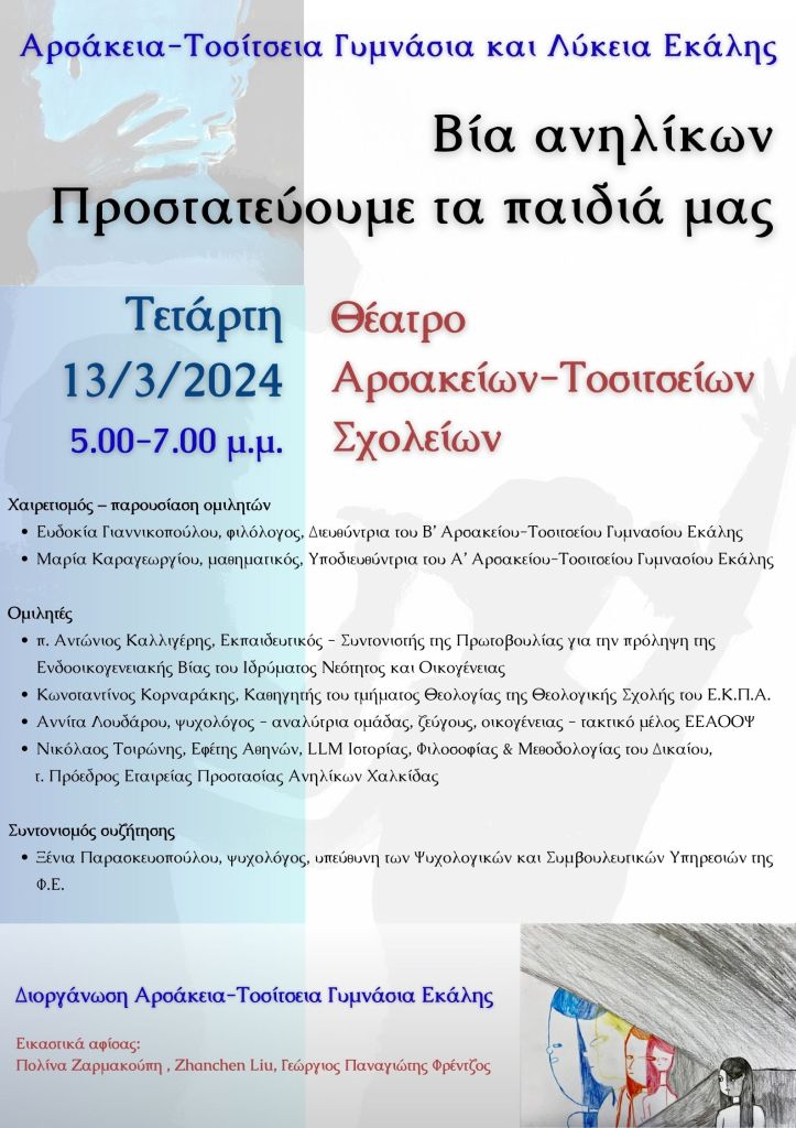 Σας προσκαλούμε σε ενημερωτική εκδήλωση που διοργανώνουν τα Αρσάκεια–Τοσίτσεια Γυμνάσια και Λύκεια Εκάλης με θέμα «Βία ανηλίκων. Προστατεύουμε τα παιδιά μας.», την Τετάρτη 13 Μαρτίου 2024 και ώρα 17.00 στο Θέατρο των Αρσακείων–Τοσιτσείων Σχολείων Εκάλης, στην οποία μπορείτε να έρθετε μαζί με τα παιδιά σας.