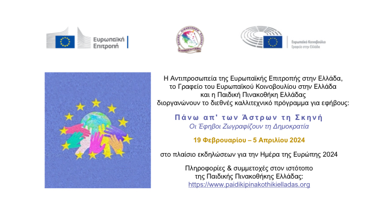 Με αφορμή τους εορτασμούς για τη Μέρα της Ευρώπης, που αποτελεί την επέτειο της απαρχής της δημιουργίας της Ευρωπαϊκής Ένωσης, καθώς και τις επερχόμενες Ευρωπαϊκές Εκλογές, αλλά και την 50η επέτειο από την αποκατάσταση της Δημοκρατίας στη χώρα μας, η Αντιπροσωπεία της Ευρωπαϊκής Επιτροπής στη Ελλάδα, το Γραφείο του Ευρωπαϊκού Κοινοβουλίου στην Ελλάδα και η Παιδική Πινακοθήκη Ελλάδας διοργανώνουν το διεθνές καλλιτεχνικό πρόγραμμα για εφήβους: «Πάνω απ’ των Άστρων τη Σκηνή – Οι Έφηβοι Ζωγραφίζουν τη Δημοκρατία». Το πρόγραμμα απευθύνεται σε μαθητές που φοιτούν στα γυμνάσια και λύκεια της χώρας και του εξωτερικού. Οι διακριθέντες καλλιτέχνες του προγράμματος θα βραβευθούν σε ειδική εκδήλωση για τη Μέρα της Ευρώπης, που διοργανώνουν η Αντιπροσωπεία της Ευρωπαϊκής Επιτροπής στη Ελλάδα και το Γραφείο του Ευρωπαϊκού Κοινοβουλίου στην Ελλάδα, στις 12 Μαΐου 2024 στο Anassa City Events, στους κήπους της Εθνικής Πινακοθήκης στην Αθήνα. Τα αριστεύσαντα έργα θα κοσμήσουν την ψηφιακή έκθεση, η οποία θα προβάλλεται στον χώρο της εκδήλωσης.