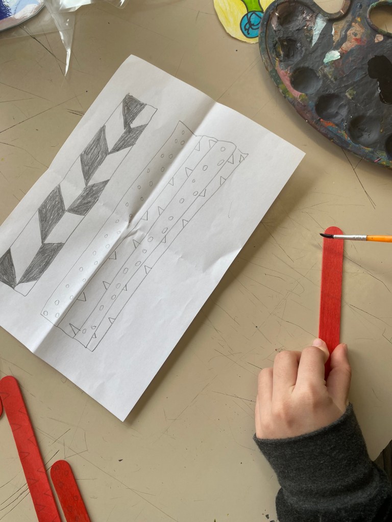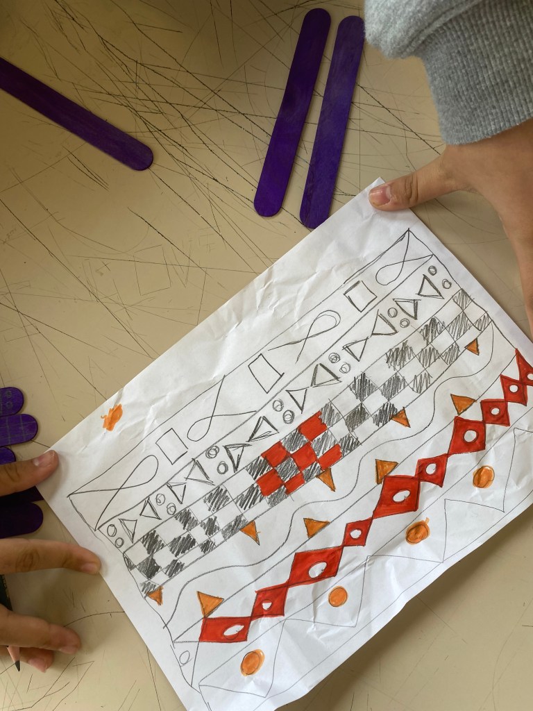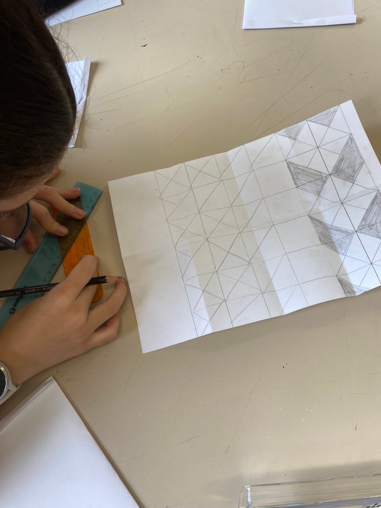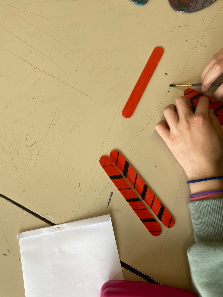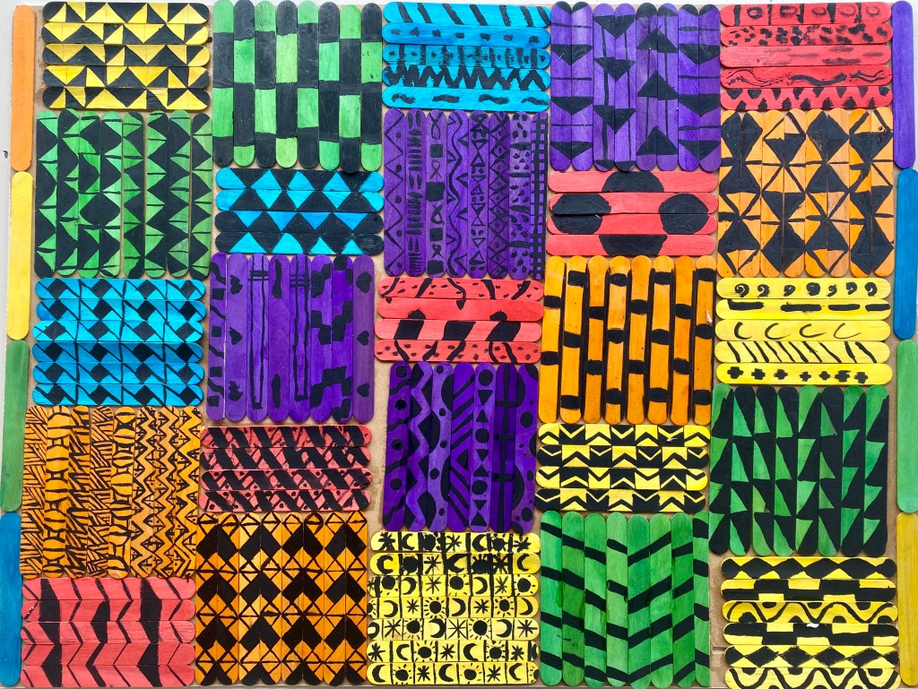 Οι μαθητές αφού παρακολούθησαν προβολή παρουσίασης αφιερωμένη στον ρυθμό στην Τέχνη, με την καθοδήγηση της καθηγήτριας Καλλιτεχνικών, ζωγράφισαν με ακρυλικά χρώματα χρωματιστά ξυλάκια και κάνοντας κολάζ δημιούργησαν ένα πρωτότυπο ομαδικό έργο διάστασης 60*80 εκ., με ρυθμό σχημάτων και χρωμάτων.