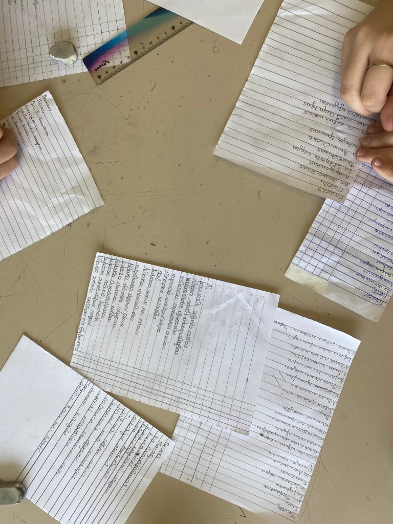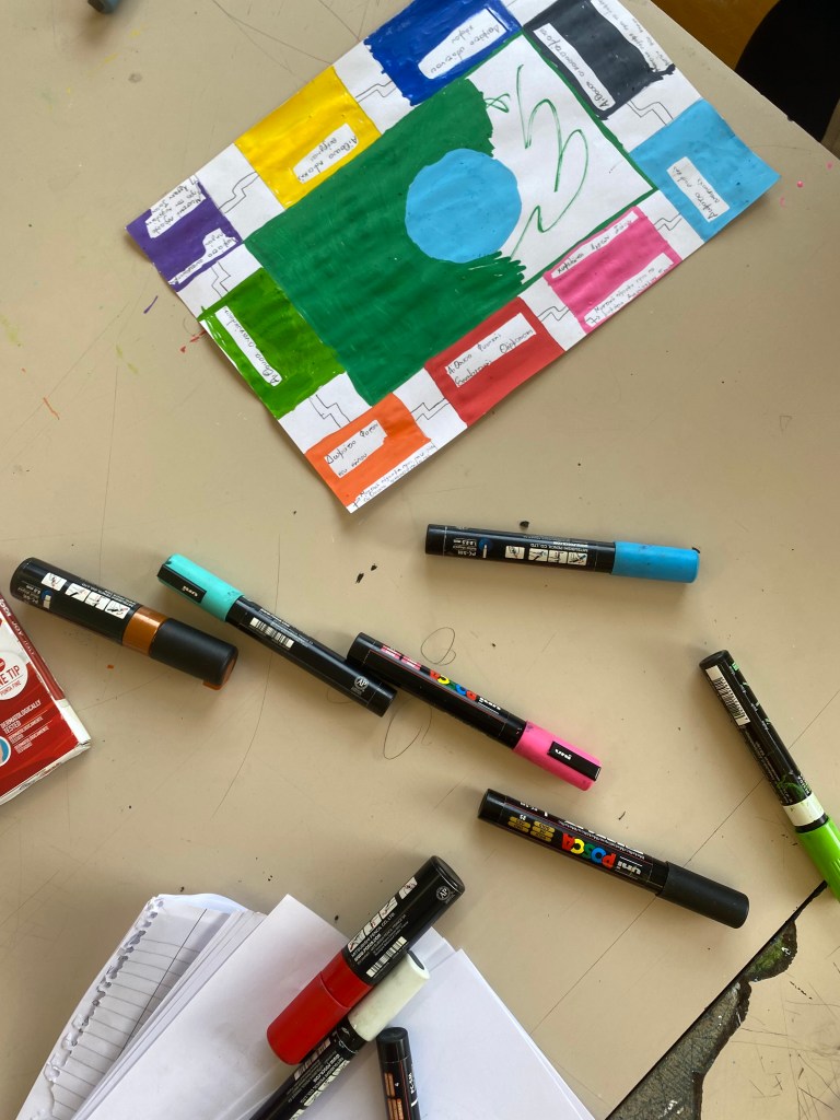 Οι εργασίες έγιναν ανά ομάδες στο εργαστήριο Καλλιτεχνικών του Σχολείου. Πιο συγκεκριμένα η ιδέα που ψηφίστηκε ήταν της μαθήτριας Αμελί Παπαβασιλείου.
