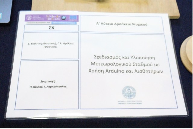 Οι καθηγητές Φυσικής, σε συνεργασία με τους μαθητές, παρουσίασαν έναν μετεωρολογικό σταθμό που κατασκευάστηκε με την πλατφόρμα Arduino. Ο σταθμός ήταν εξοπλισμένος με αισθητήρες θερμοκρασίας, υγρασίας και ατμοσφαιρικής πίεσης, με τα δεδομένα να προβάλλονται σε πραγματικό χρόνο στην οθόνη υπολογιστή μέσω ειδικά σχεδιασμένου αλγορίθμου. Επιπλέον, η θερμοκρασία και η υγρασία απεικονίζονταν σε ένα RGB LED, το οποίο άλλαζε χρώμα ανάλογα με τις καιρικές συνθήκες.