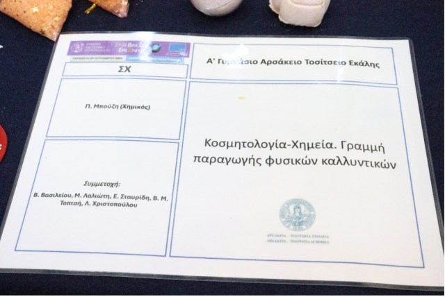 Το Α’ Αρσάκειο – Τοσίτσειο Γυμνάσιο Εκάλης παρουσίασε την εργασία με τίτλο «Κοσμητολογία – Χημεία: Γραμμή Παραγωγής Φυσικών Καλλυντικών», στην οποία συμμετείχαν μαθητές της Γ’ Γυμνασίου σε συνεργασία με την καθηγήτρια Χημείας.
