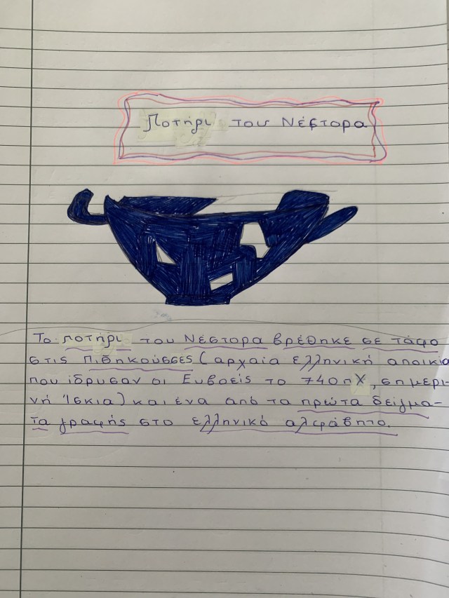 Οι πρώτες αλφαβητικές επιγραφές στην ελληνική γλώσσα χρονολογούνται γύρω στα μέσα του 8ου αιώνα π.Χ. Το ενδιαφέρον είναι ότι τα πρώτα αυτά κείμενα είναι όλα ιδιωτικού χαρακτήρα. Στο πρώτο αγγείο αυτής της εποχής από το νησί Πιθηκούσες που εξέτασαν οι μαθητές, διάβασαν την επιγραφή του με κατεύθυνση από τα δεξιά προς τα αριστερά (ἐπὶ τὰ λαιά) σε τρεις ξεχωριστές γραμμές, η οποία αναφέρει: «Είμαι το γλυκόπιοτο ποτήρι του Νέστορα. Όποιος πιει από τούτο το ποτήρι, αυτόν αμέσως θα τον κυριέψει ο πόθος της Αφροδίτης με το όμορφο στεφάνι.» Το αγγείο, σαν να είχε ψυχή και ανθρώπινη λαλιά αποκαλύπτει στους μαθητές την ταυτότητά του. Αρκετοί ερευνητές μάλιστα θεωρούν ότι ο Νέστωρ είναι ο Ομηρικός βασιλιάς της Πύλου, και το ποτήρι του είναι το περιγραφόμενο στον Όμηρο (11.632-7), ενώ άλλοι αρνούνται τον συσχετισμό και πιστεύουν πως πρόκειται για κάποιον άλλο Νέστορα, κάτοχο του ποτηριού.