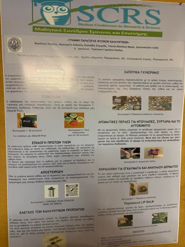 Την Κυριακή 24 Νοεμβρίου 2024 συμμετείχαν οι μαθητές μας Βασιλείου Βασίλης, Μαργαρίτα Λαλιώτη, Ευσταθία Σταυρίδη, Τοπτσή Βασιλική Μαρία και Χριστοπούλου Λυδία με ανάρτηση αφίσας (poster) με θέμα «Γραμμή παραγωγής φυσικών καλλυντικών προϊόντων», στην οποία οι μαθητές ανέπτυξαν μια ολοκληρωμένη γραμμή παραγωγής. Υπεύθυνοι καθηγητές: Πάολα Μπούζη (Χημικός), Αδαμαντία Ξηρίδου (Πληροφορικός) και Ανδρέας Χατζηορφανός (Πληροφορικός).
