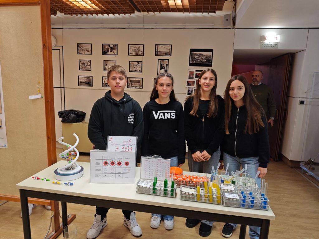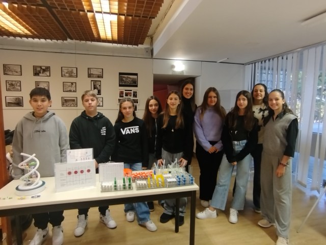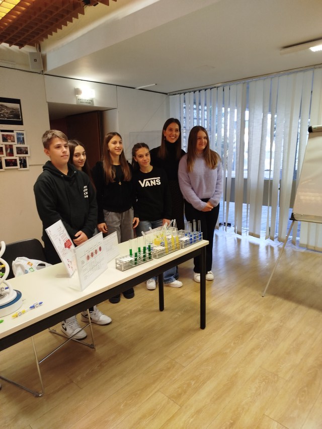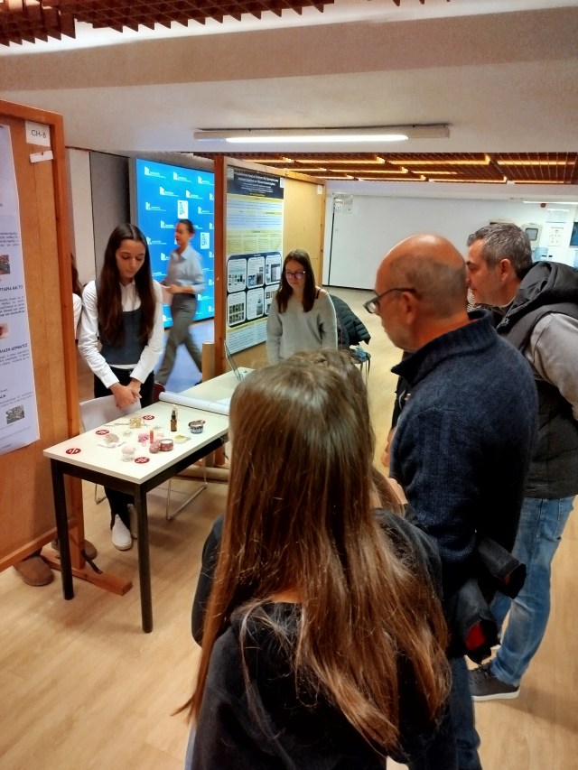 Επίσης, την ίδια ημέρα, οι μαθητές μας, Κοκολάκης Ανδρέας, Μπούκλη Ευγενία, Παπανικολάου Νίκη και Σικοτακοπούλου Μαρία Ειρήνη παρουσίασαν με ιδιαίτερο ενθουσιασμό ένα πείραμα Βιολογίας, το οποία είχαν προετοιμάσει κατά τη διάρκεια της Ζώνης Βιολογίας του σχολικού μας προγράμματος. Το πείραμα προσομοίαζε τη συμβατότητα των ομάδων αίματος σε μια πιθανή μετάγγιση. Χρησιμοποιώντας χρώματα ζαχαροπλαστικής αναπαρέστησαν τις τέσσερις ομάδες αίματος με βάση τα αντιγόνα Α και Β (Σύστημα ΑΒΟ) με διαφορετικά χρώματα και το αντιγόνο D (Σύστημα Rhesus) με χρυσόσκονη, απέδειξαν ποιες ομάδες είναι συμβατές και ποιες μη συμβατές σε μια πιθανή μετάγγιση. Ταυτόχρονα, εξήγησαν το θεωρητικό υπόβαθρο της ύπαρξης των αντιγόνων στην επιφάνεια των ερυθροκυττάρων αξιοποιώντας ένα 3D ερυθροκύτταρο το οποίο είχε τη δυνατότητα προσθήκης και αφαίρεσης όλων των αντιγόνων. Η κατασκευή του έγινε υπό την επίβλεψη του κ. Ανδρέα Χατζηορφανού, καθηγητή Πληροφορικής, στον 3D Printer του Σχολείου μας. Οι επισκέπτες είχαν τη δυνατότητα να δουν από κοντά την παρουσίαση της πειραματικής διαδικασίας σε πραγματικό χρόνο καθώς και το poster που προετοιμάστηκε από την ομάδα των μαθητών μας. Υπεύθυνη καθηγήτρια: Αλεξάνδρα Μπάκα (Βιολόγος).