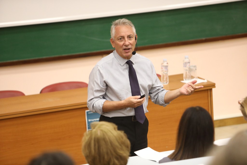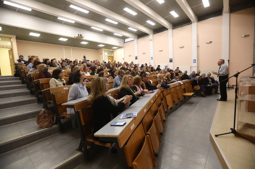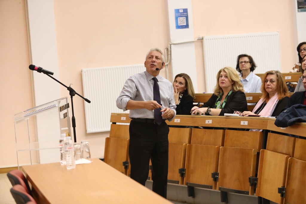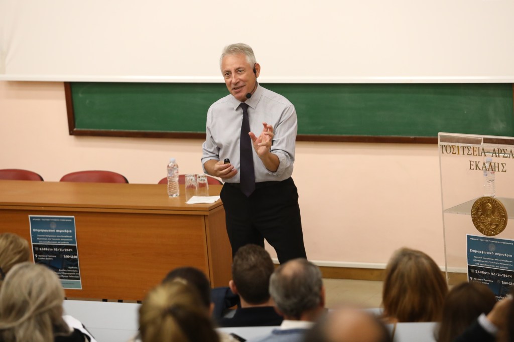 Στη συνέχεια, ο ομιλητής επεσήμανε την ανάγκη για διαρκή προσαρμογή και δυναμική μάθηση, αφού η αξιοποίηση της τεχνητής νοημοσύνης μπορεί να φέρει τον εκπαιδευτικό πιο κοντά στον μαθητή. Παράλληλα, αναφέρθηκε στο πλαίσιο σωστής λειτουργίας και τα ηθικά θέματα που εγείρονται, υπογραμμίζοντας τον σκεπτικισμό της κοινωνίας, μεγάλο μέρος της οποίας προτείνει επιβράδυνση των εξελίξεων στον τομέα αυτό. Κλείνοντας, ο κ. Οικονόμου έδωσε έμφαση στη σημασία της προσωπικότητας του δασκάλου στην επίτευξη ποιοτικής εκπαίδευσης και επεσήμανε ότι η τεχνολογία μπορεί να ενισχύσει, αλλά όχι να υποκαταστήσει τον ανθρώπινο παράγοντα. Απέρριψε έτσι την ιδέα ότι η τεχνολογική επανάσταση οδηγεί σε «δημιουργική καταστροφή» και υποστήριξε ότι, αξιοποιώντας τα οφέλη της και μετριάζοντας τους κινδύνους της, η τεχνητή νοημοσύνη μπορεί να διαμορφώσει το μέλλον της εκπαίδευσης, ενδυναμώνοντας τους μαθητές, υποστηρίζοντας τους εκπαιδευτικούς και ενθαρρύνοντας ένα περιβάλλον μάθησης με λιγότερους αποκλεισμούς και περισσότερη δικαιοσύνη.