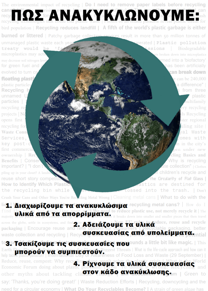 Καθημερινά ενημερωνόμαστε για οικολογικές καταστροφές σε όλο τον κόσμο, για την αλλοίωση του φυσικού περιβάλλοντος και τις συνέπειες που θα έχει αυτή η εξέλιξη στις ζωές μας. Ευτυχώς, ο σύγχρονος άνθρωπος φαίνεται να είναι πιο ευαισθητοποιημένος σε οικολογικά θέματα. Γι’ αυτόν τον λόγο, το σχολείο μας οργανώνει διάφορες περιβαλλοντικές δράσεις. Συγκεκριμένα, την τρέχουσα σχολική χρονιά 2024–25, μαθητές και μαθήτριες δημιούργησαν αφίσες που προωθούν την ανακύκλωση, αναδεικνύουν τη σημασία της και ενημερώνουν για τον τρόπο με τον οποίο πρέπει να γίνεται. Πέρα από αυτό, τοποθετήθηκαν ειδικοί κάδοι ανακύκλωσης σε διάφορους χώρους του σχολείου, αλλά και έξω από τις διδακτικές αίθουσες. Έτσι, μαθητές και εκπαιδευτικοί θα έχουν τη δυνατότητα να ανακυκλώνουν τις συσκευασίες των προϊόντων που καταναλώνουν (χαρτί και πλαστικό). Όλα τα τμήματα του Σχολείου μας θα αναλάβουν εκ περιτροπής τη συγκέντρωση των ανακυκλώσιμων υλικών, τα οποία θα απορρίπτουν σε κάδους που έχουν τοποθετηθεί στις πύλες του Σχολείων μας από τον Δήμο Διονύσου. Επιπλέον, προγραμματίζουμε να γίνει αναλυτική ενημέρωση από φορέα ειδικό στα θέματα αυτά.