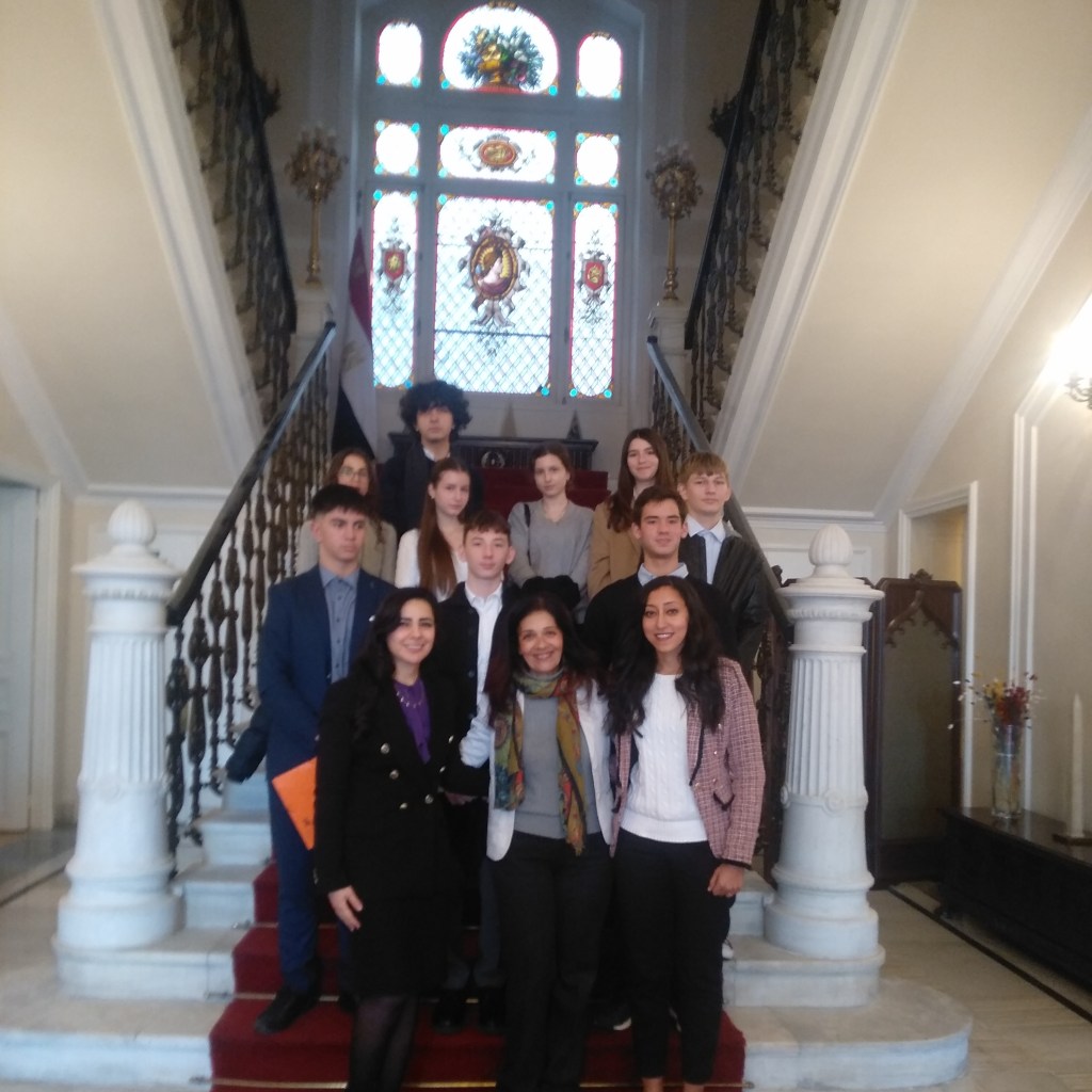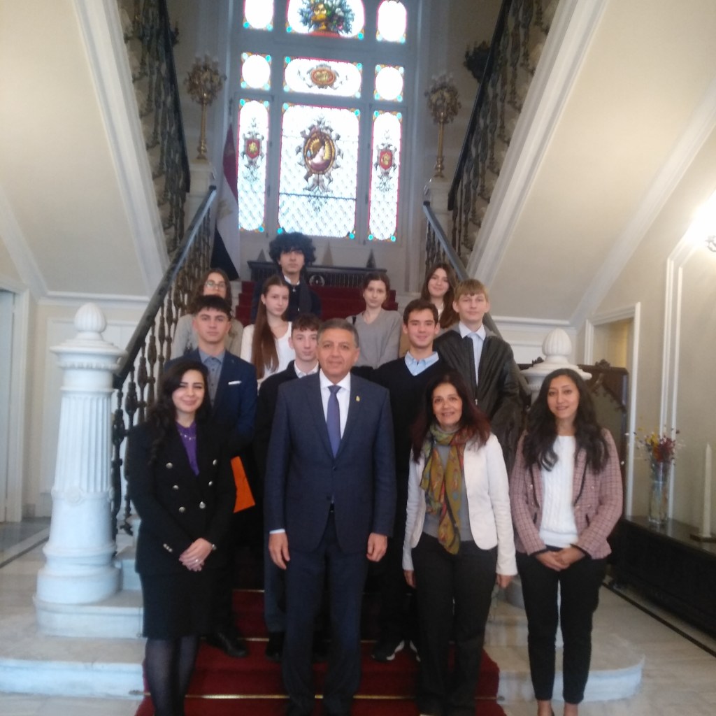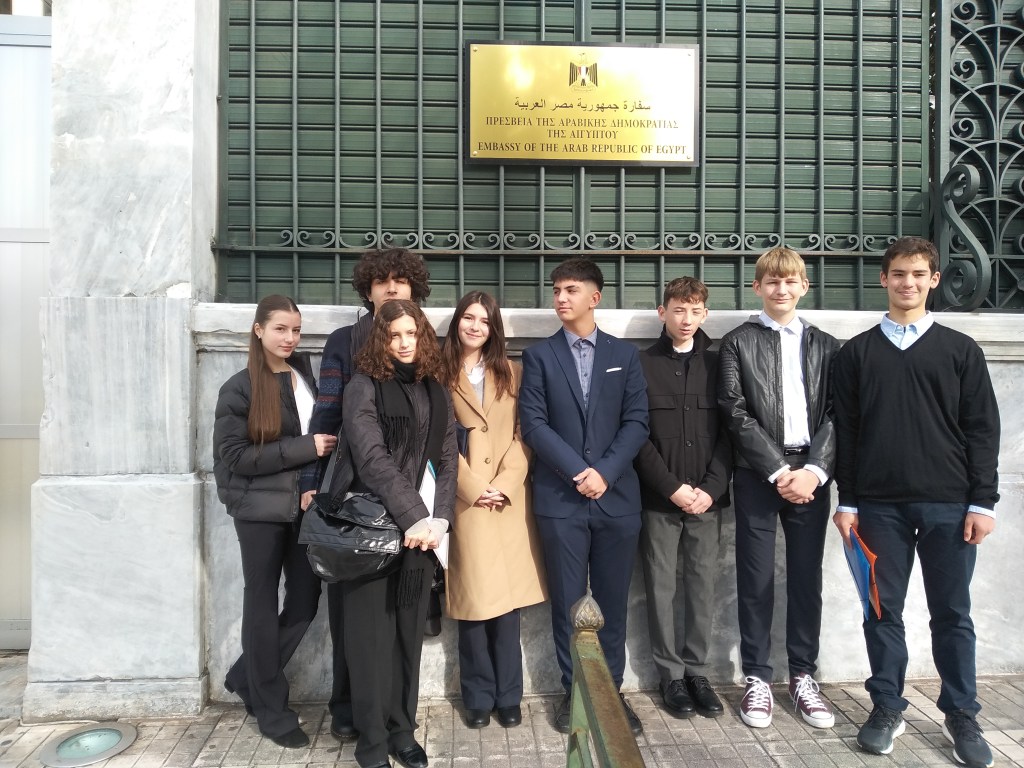 Την Τετάρτη 15 Ιανουαρίου 2025 οι μαθητές/τριες του τμήματος M.U.N. της Ζώνης Πολιτισμού Γ’ τάξης του Σχολείου μας πραγματοποίησαν επίσκεψη στην πρεσβεία της Αραβικής Δημοκρατίας της Αιγύπτου, στο πλαίσιο της προετοιμασίας τους σχετικά με τη συμμετοχή τους στο 4ο Μαθητικό Μοντέλο Ο.Η.Ε, που διοργανώνεται από το Βρετανικό Σχολείο Αγ. Αικατερίνης, St Catherine’s M.U.N 2025.