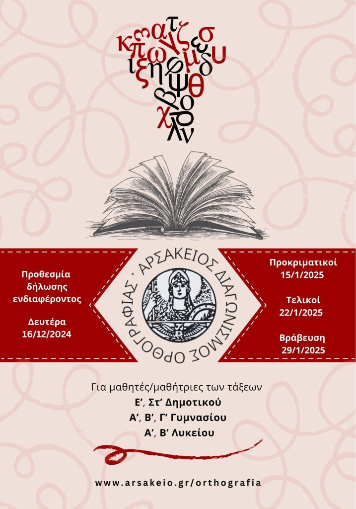 Την Τετάρτη 15 Ιανουαρίου 2025 διεξήχθη η Α’ (προκριματική) φάση του 2ου Αρσάκειου Διαγωνισμού Ορθογραφίας στα Αρσάκεια-Τοσίτσεια Σχολεία. Ο διαρσακειακός αυτός Διαγωνισμός αποτελεί πρόταση του Προέδρου των Αρσακείων, καθηγητή κ. Γ. Μπαμπινιώτη, και πηγάζει από την έγνοια του για τα γλωσσικά μας θέματα, η οποία έχει αποτυπωθεί στο σύνολο του επιστημονικού του έργου. Από το Α’ Αρσάκειο-Τοσίτσειο Γυμνάσιο Εκάλης συμμετείχαν 82 μαθητές, από τους οποίους προκρίθηκαν στη Β’ (τελική) φάση, την Τετάρτη 22 Ιανουαρίου 2024, δώδεκα μαθητές, τέσσερεις από κάθε τάξη, και συγκεκριμένα: Ναταλία Μαρία Βούρβαχη (Α1), Θεόδωρος Κέκκος (Α1), Κωνσταντίνος Κουριδάκης (Β3), Άννα-Μαρία Κωνσταντίου (Γ2), Μελίνα Λαζάρου (Γ2), Αναστασία Μακρυγιάννη (Β3), Μαριάνθη Ξύστρα (Α2), Αχιλλέας Περιβολιώτης (Α3), Νικόλαος Σούκουλης (Β2), Αλίκη Σταυράκη (Β3), Μαρία Ροζάρια Τσιρίλο (Γ3) και Κατερίνα Φάρου (Γ4).