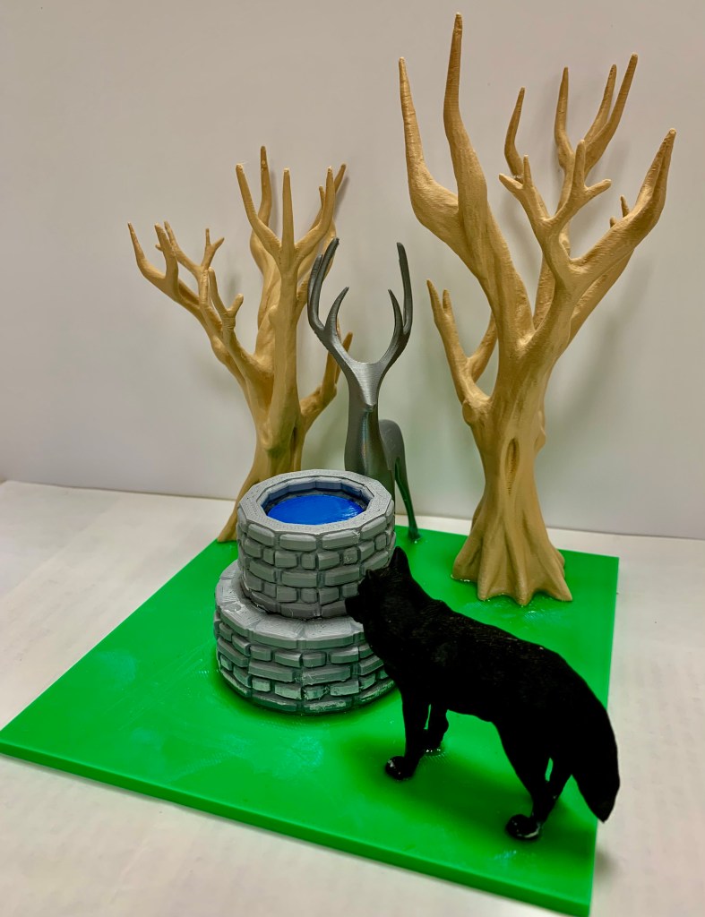 Τέλος, ο μαθητής μας, Τσιοτσίκας Ιωαννίδης Χρήστος, χάρισε στον μύθο του Αισώπου σχήμα και μορφή μέσα από την τεχνολογία της τρισδιάστατης εκτύπωσης. Μια μακέτα κατασκευασμένη με 3D printer αποτυπώνει τη στιγμή που το ελάφι θαυμάζει την αντανάκλασή του στο νερό, ενώ η απειλή πλησιάζει. Μπορούμε να διακρίνουμε το ελάφι με τα επιβλητικά του κέρατα, το δάσος που δημιουργεί μια αίσθηση μυστηρίου, μιας και τα κλαδιά αργότερα παγιδεύσουν το ελάφι, το οποίο μοιραία θα πιαστεί από τον απειλητικό λύκο, που παραμονεύει στη σκιά.