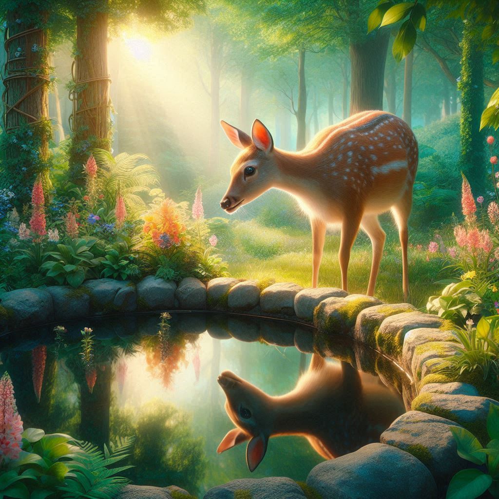 Σειρά στις δημιουργίες πήρε ο μαθητής Περιβολιώτης Αχιλλέας, ο οποίος αξιοποίησε με άριστο τρόπο τη δύναμη της τεχνητής νοημοσύνης δημιουργώντας δύο ψηφιακές απεικονίσεις του μύθου. Η πρώτη εικόνα αποδίδει την αυταρέσκεια του ελαφιού, τονίζοντας τη σκοτεινή πλευρά της ματαιοδοξίας του, ενώ η δεύτερη δίνει έναν πιο ονειρικό τόνο, παρουσιάζοντας το ελάφι σε ένα μαγευτικό φυσικό τοπίο, τη στιγμή που θαυμάζει την ομορφιά του.