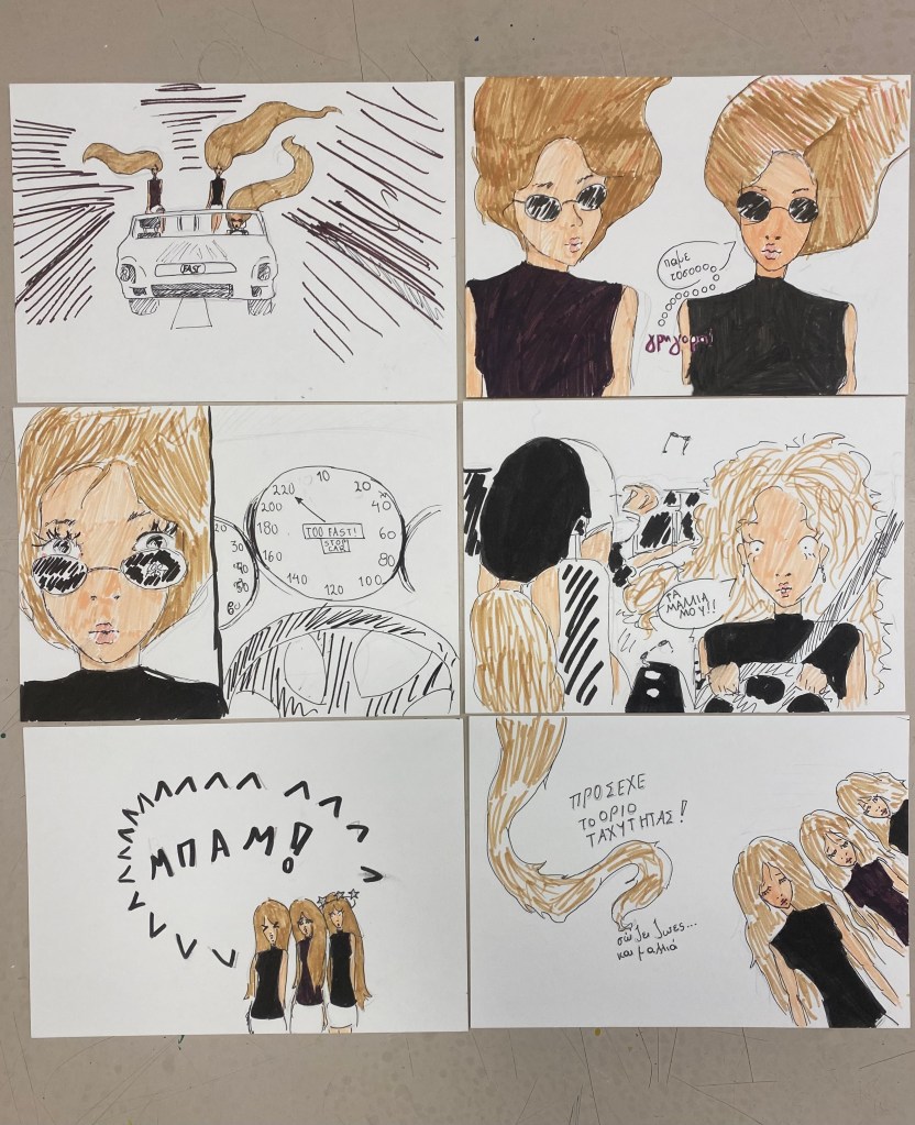 Αμαλία Παριανού: Τρία ανέμελα κορίτσια με πολύ μακριά μαλλιά οδηγούν στην πόλη, υπερβαίνοντας το όριο ταχύτητας. Καθώς η οδηγός συνειδητοποιεί ότι δεν μπορεί να σταματήσει το αυτοκίνητο λόγω της μεγάλης ταχύτητας, είναι ήδη αργά. Το αυτοκίνητο συγκρούεται και τα μαλλιά τους καταστρέφονται ολοσχερώς! Μέσα από αυτό το κωμικό στοιχείο, το κόμικ θέλει να περάσει ένα σοβαρό μήνυμα: η υπερβολική ταχύτητα μπορεί να προκαλέσει σοβαρά ατυχήματα! Εκτός από τον κίνδυνο για τη ζωή, μπορεί να καταστραφούν και πράγματα που εκτιμάμε – ακόμα και τα μαλλιά μας! Σκοπός μου ήταν να θίξω το ζήτημα με χιούμορ, αλλά και προβληματισμό.