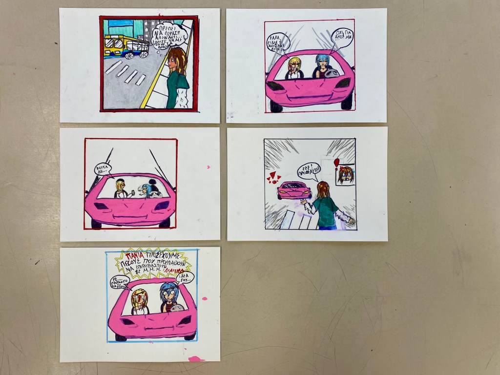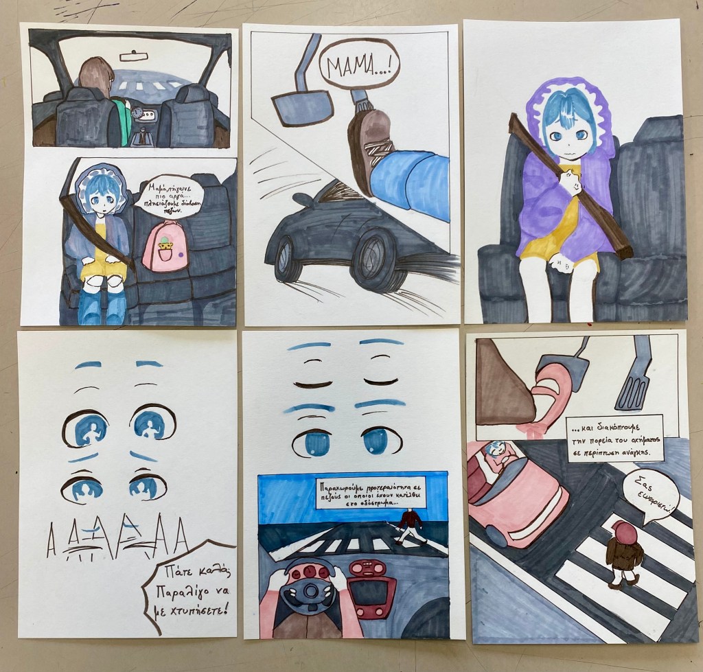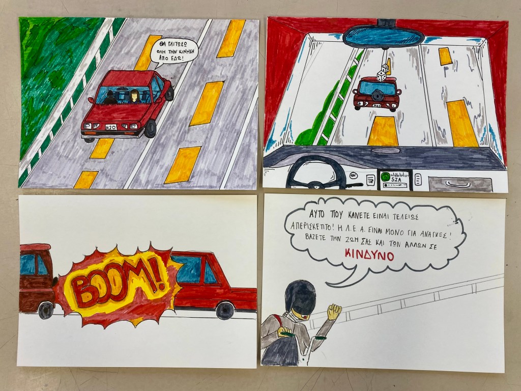 Οι μαθητές της Γ’ τάξης του Σχολείου μας, Νικόλας Δοβλέτης, Δέσποινα Καζέπη, Αμαλία Παριανού και Βικτώρια Σακελλαρίου στο πλαίσιο του μαθητικού Καλλιτεχνικού Διαγωνισμού Κόμικ, ο οποίος διοργανώνεται από τη Διεύθυνση Δευτεροβάθμιας Εκπαίδευσης Ανατολικής Αττικής, σε συνεργασία με το Υπουργείο Παιδείας, Θρησκευμάτων και Αθλητισμού και το Υπουργείο Υποδομών και Μεταφορών με τίτλο «Με ασφάλεια στον προορισμό, με φαντασία στην τέχνη», δημιούργησαν πρωτότυπα κόμικ με θέμα την οδική ασφάλεια. Με αίσθημα ευθύνης ως προς τη σωστή οδική συμπεριφορά, οι μαθητές εργάστηκαν πάνω στα θέματα που τους ανατέθηκαν από την επιτροπή του διαγωνισμού και παρήγαγαν δημιουργικές ιστορίες. Παράλληλα, συνέταξαν και ένα συνοδευτικό κείμενο, στο οποίο ανέλυσαν την ιδέα και την προσέγγισή τους, τεκμηριώνοντας το περιεχόμενο του έργου τους.