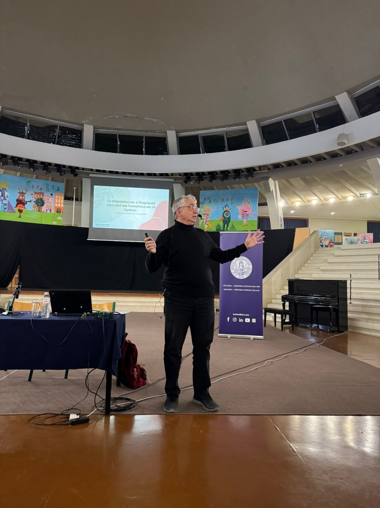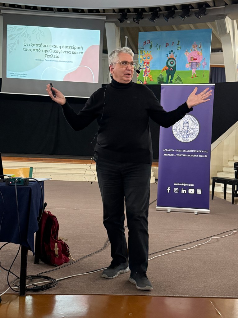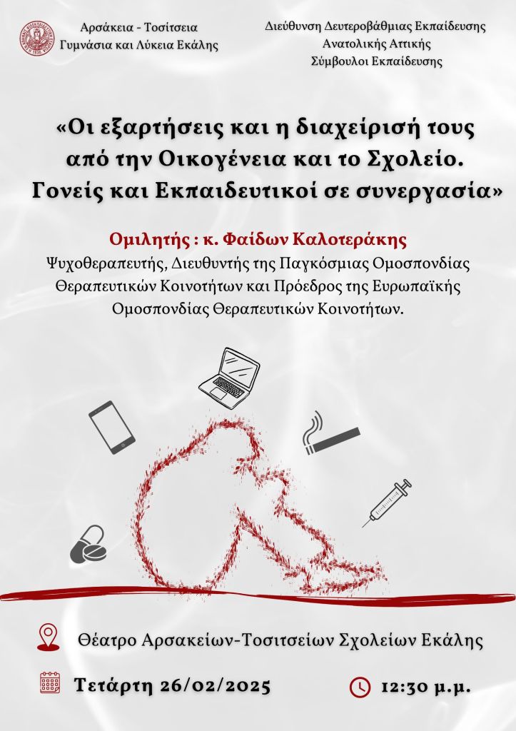 Τα Αρσάκεια-Τοσίτσεια Γυμνάσια και Λύκεια Εκάλης, στο πλαίσιο των ποικίλων επιμορφώσεων και δράσεων που πραγματοποιούν, διοργάνωσαν, σε συνεργασία με τους Συμβούλους Εκπαίδευσης της Δευτεροβάθμιας Εκπαίδευσης Ανατολικής Αττικής, επιμορφωτική δράση για γονείς και εκπαιδευτικούς, με θέμα: «Οι εξαρτήσεις και η διαχείρισή τους από την Οικογένεια και το Σχολείο. Γονείς και Εκπαιδευτικοί σε συνεργασία», την Τετάρτη 26 Φεβρουαρίου 2025, στο Θέατρο των Αρσακείων-Τοσιτσείων Σχολείων Εκάλης. Προσκεκλημένος ομιλητής ήταν ο κ. Φαίδων Καλοτεράκης, ψυχοθεραπευτής, διευθυντής της Παγκόσμιας Ομοσπονδίας Θεραπευτικών Κοινοτήτων και πρόεδρος της Ευρωπαϊκής Ομοσπονδίας Θεραπευτικών Κοινοτήτων. Στόχος της εκδήλωσης ήταν η ενημέρωση των γονέων και των εκπαιδευτικών πάνω σε φλέγοντα θέματα που αφορούν στις εξαρτήσεις των νέων (κάπνισμα, διαδίκτυο, ουσίες), στην πρόληψη και στη διαχείρισή τους, καθώς, επίσης, και στην επικοινωνία μεταξύ γονέων και εκπαιδευτικών, την ανάδειξη του προβλήματος και την κατανόηση της έκτασής του.