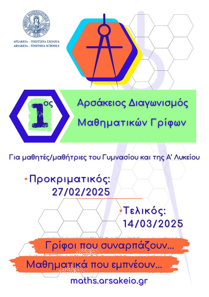 Η τελική φάση του Αρσάκειου Διαγωνισμού Μαθηματικών Γρίφων διεξήχθη στις 14/03/2025. Ο διαγωνισμός έλαβε χώρα στο Σχολείο μας και πήραν μέρος 10 μαθητές και μαθήτριες της Α’ και Β’ τάξης στο 1ο επίπεδο και άλλοι 4 της Γ’ τάξης στο 2ο επίπεδο. Διακρίθηκαν οι μαθητές: