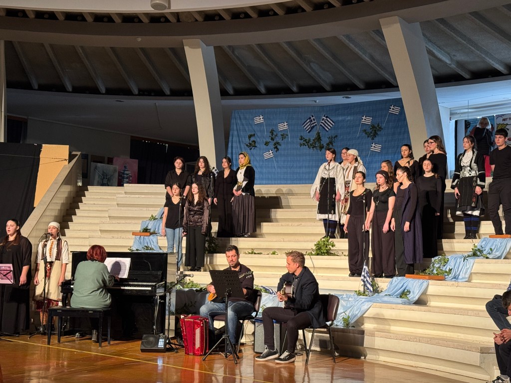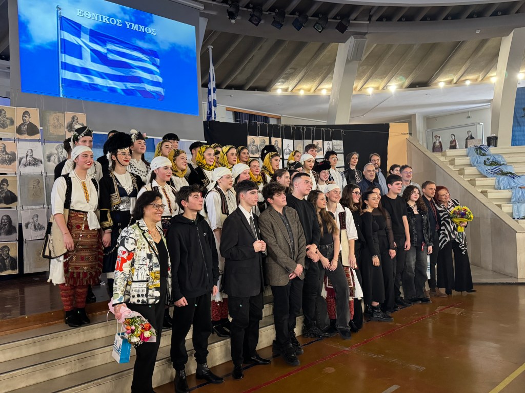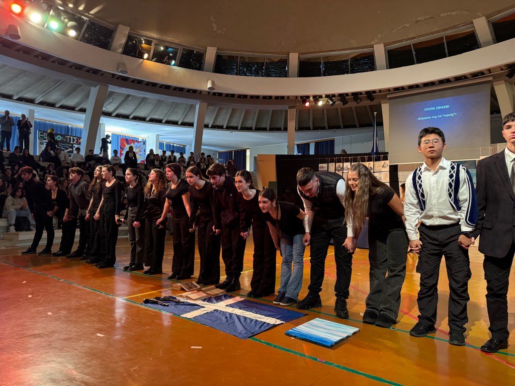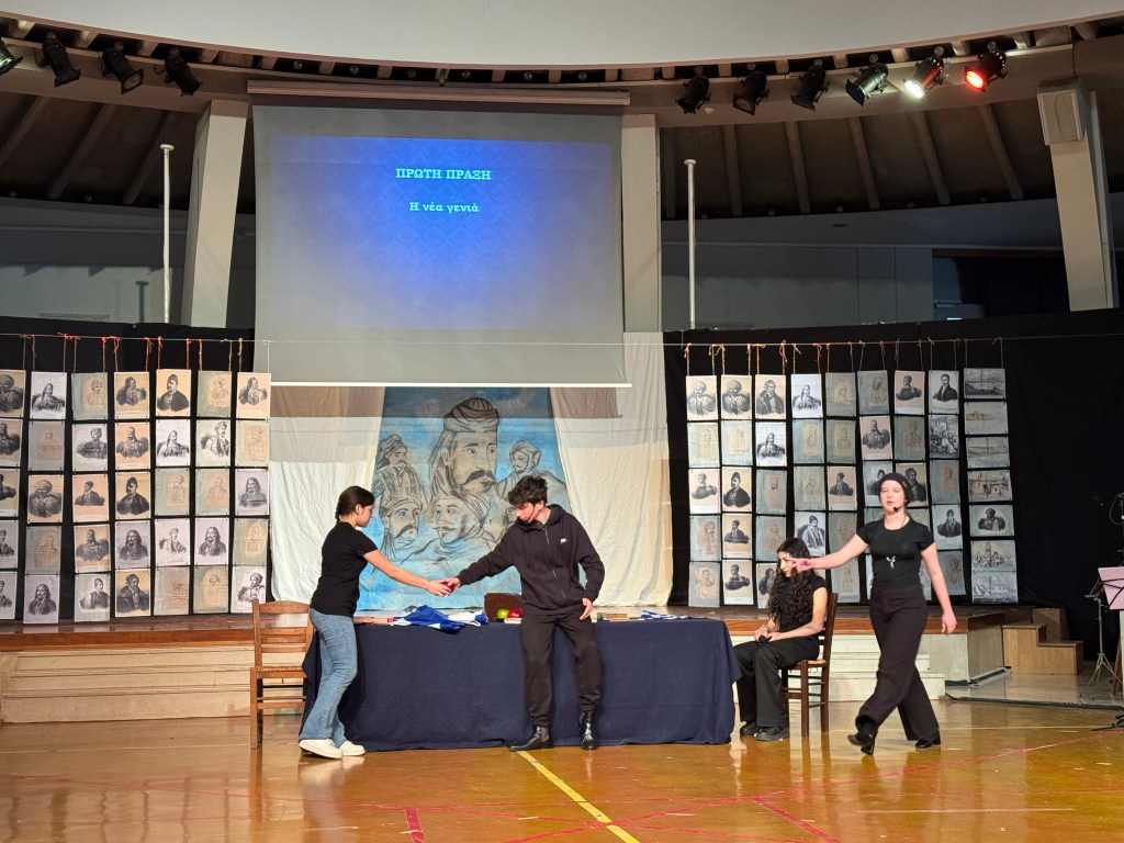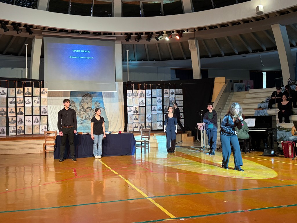 Έπειτα ρίγη συγκίνησης και περηφάνιας συνεπήραν το κοινό που παρακολούθησε ένα εμπνευσμένο θεατρικό έργο, γραμμένο και σκηνοθετημένο από τους κκ. Μαριέττα Καλαμαρά, φιλολόγο, Γεωργία Κοντού, φιλολόγο, και Μάρκο Σαρρή, βιολόγο. Οι μαθητές ερμήνευσαν μοναδικά τους ρόλους τους με την καθοδήγηση του θεατρολόγου κ. Κωνσταντίνου Θεοδώρου, σε ένα δρώμενο που συνδύαζε ποίηση, ιστορικά κείμενα και τον μοντέρνο λόγο μιας σύγχρονης οικογένειας, που νιώθει το χρέος να τιμά το παρελθόν. Το άρτιο θέαμα πλαισίωσαν τόσο τα μελωδικά τραγούδια που ερμήνευσε η χορωδία, με τη χορωδιακή επεξεργασία, τη διδασκαλία, τη διεύθυνση και το πιάνο της Συντονίστριας Μουσικών και υπεύθυνης του Μουσικού Ομίλου των Αρσακείων κ. Χριστίνας Βαρσάμη-Κούκνη, όσο και το υποβλητικό σκηνικό που δημιούργησε η εικαστικός κ. Κυριακή Πρεβενιού, με τη βοήθεια μαθητών της Α’ και Γ’ τάξης του Α’ Λυκείου.