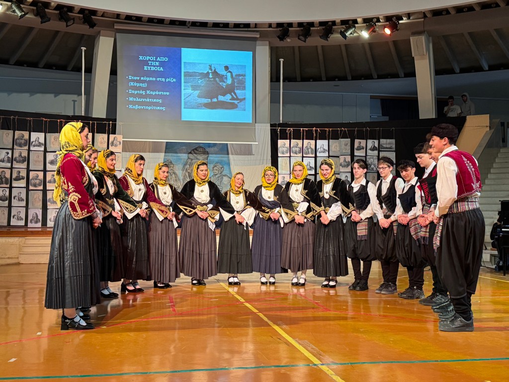 Ακολούθησε μια πρωτότυπη παρουσίαση και επίδειξη ελληνικών παραδοσιακών στολών από περιοχές της Ελλάδας και αντίστοιχοι παραδοσιακοί χοροί, τους οποίους παρουσίασαν με κέφι και χάρη μαθητές και μαθήτριες της Α’ τάξης, με διδασκαλία της καθηγήτριας Φυσικής Αγωγής κ. Γεωργίας Χατζηστάμου. Η γιορτή ολοκληρώθηκε με το ενθουσιώδες χειροκρότημα του κοινού που μαζί με τους συντελεστές ύμνησαν το φως και ξόρκισαν το σκοτάδι…