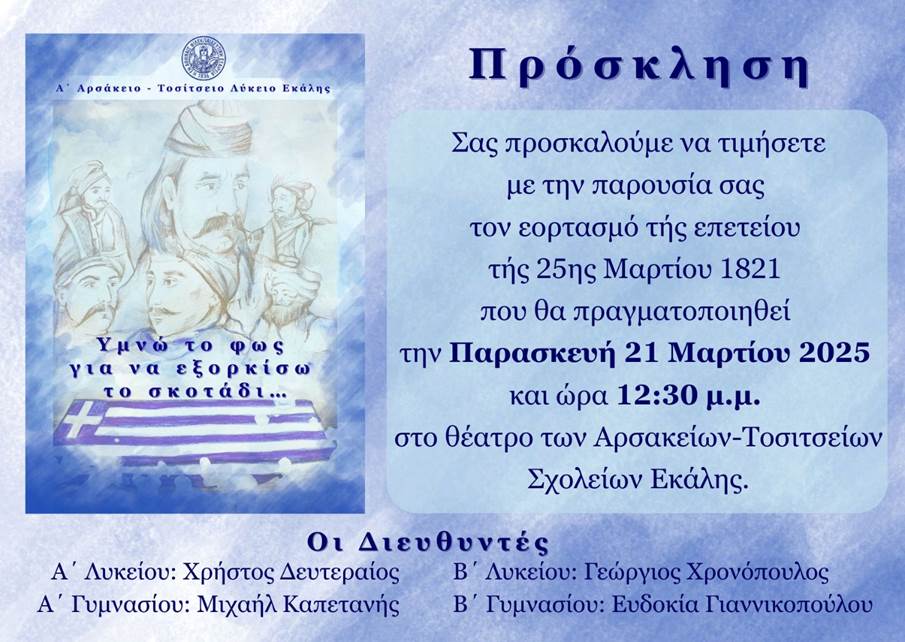 Την Πέμπτη 20 Μαρτίου 2025 οι μαθητές του Α’ Αρσακείου–Τοσιτσείου Γυμνασίου Εκάλης παρακολούθησαν την γιορτή με την οποία το Α’ Αρσάκειο-Τοσίτσειο Λύκειο Εκάλης τίμησε την επέτειο της εθνεγερσίας του 1821. Η γιορτή ξεκίνησε με τη Διευθύντρια του Β’ Αρσακείου–Τοσιτσείου Γυμνασίου Εκάλης κ. Ευδοκία Γιαννικοπούλου, η οποία εκφώνησε έναν μεστό και ουσιαστικό πανηγυρικό λόγο.