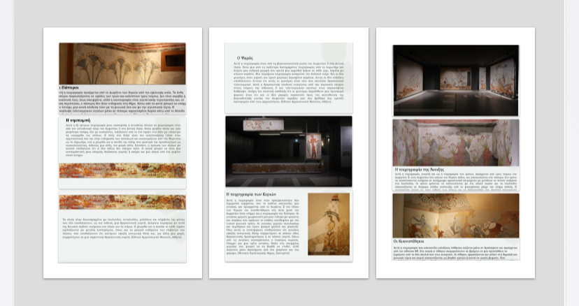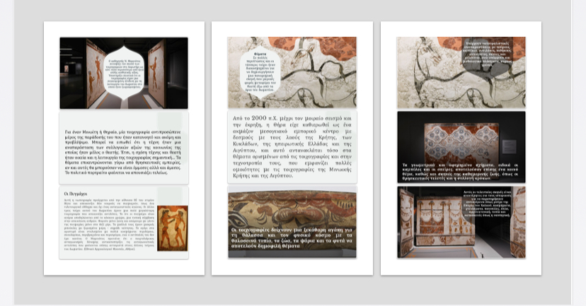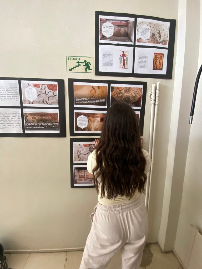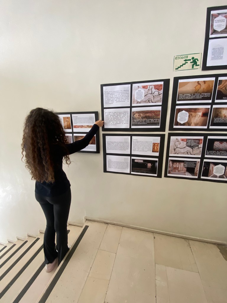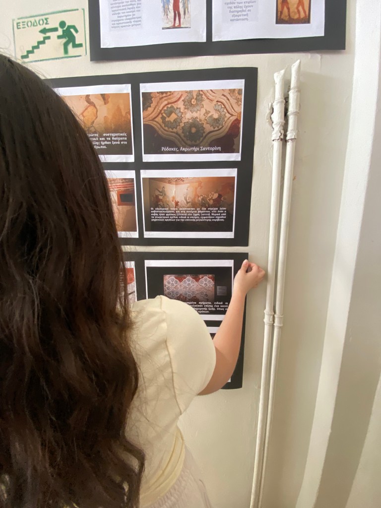 Οι μαθητές της Ζώνης Πολιτισμού Γ´ Γυμνασίου του τμήματος «Τα παιδιά ζωγραφίζουν στους τοίχους» με την καθοδήγηση της καθηγήτριας Καλλιτεχνικών κ. Κυριακής Πρεβενιού, μας παρουσιάζουν τις πιο εμβληματικές τοιχογραφίες όλων των εποχών που προέρχονται από την αρχαία Θήρα. Η έκθεση αυτή αποτελεί μια μελέτη στον μοναδικό κόσμο των τοιχογραφιών της Εποχής του Χαλκού από το Ακρωτήρι της Θήρας, αποκαλύπτοντας την απαράμιλλη αισθητική και πολιτιστική τους σημασία.
