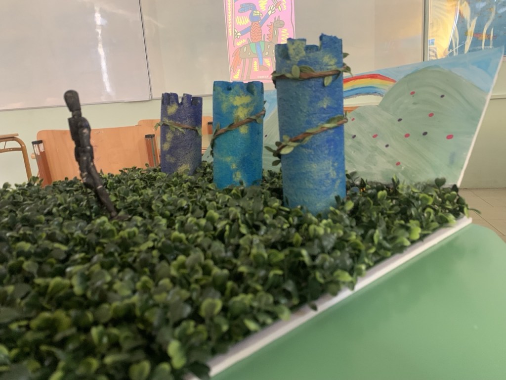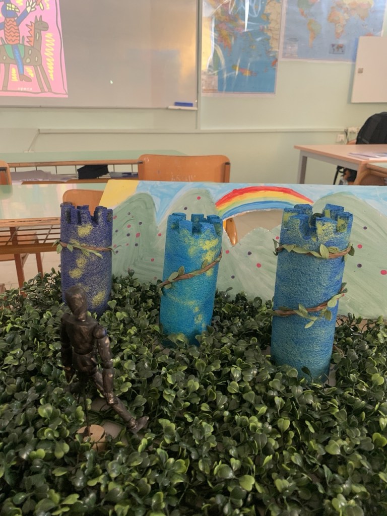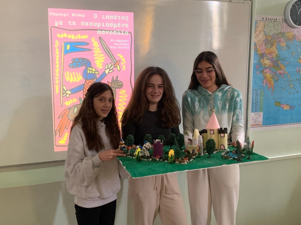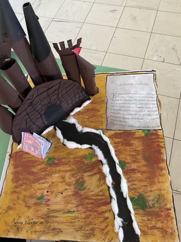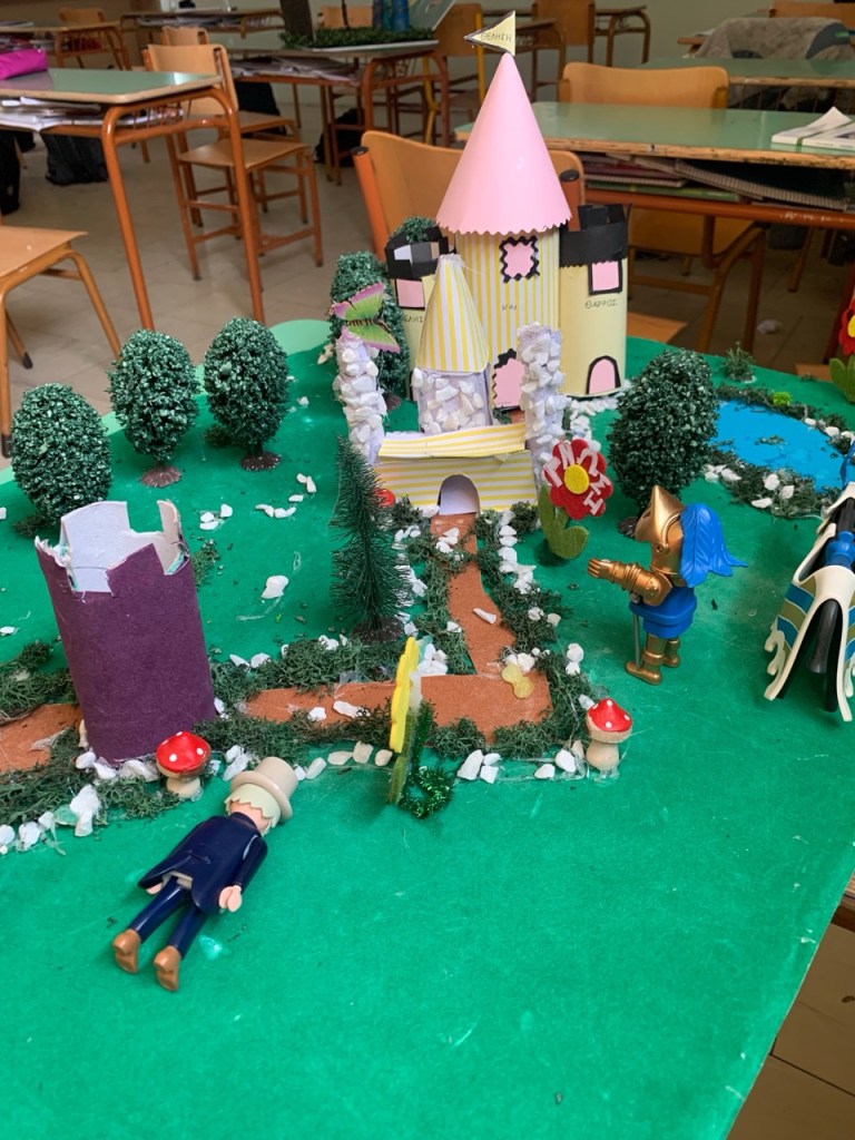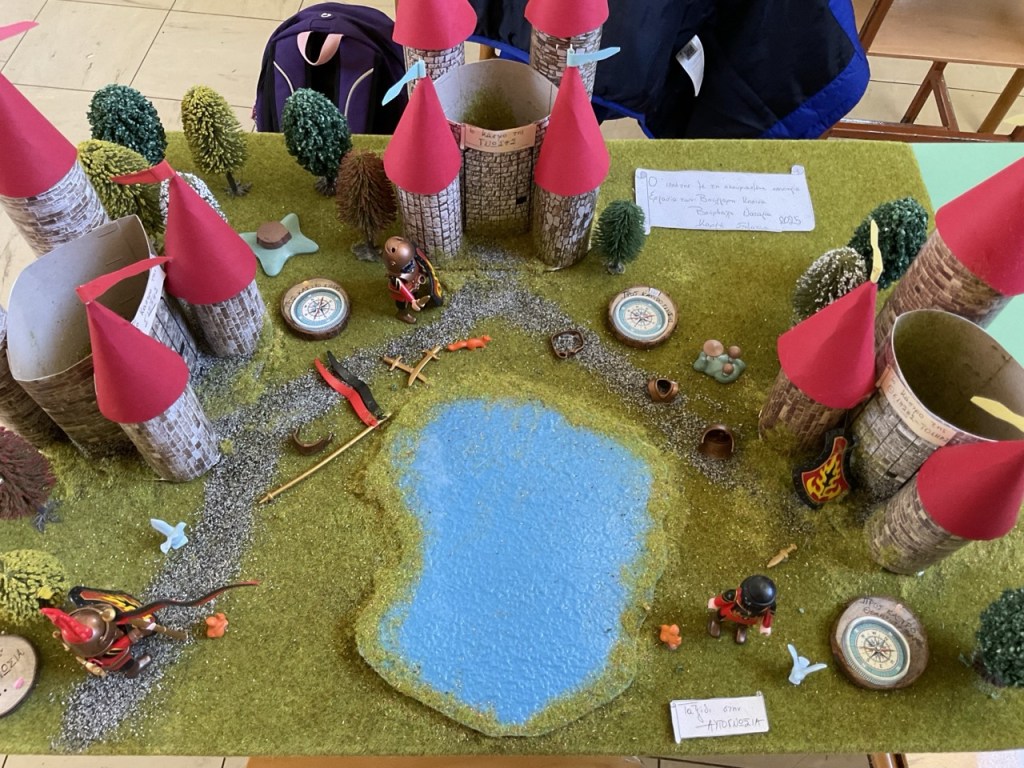 Δημιουργία κατασκευών και μακέτας: Κάθε ομάδα ανέλαβε να αποδώσει εικαστικά τη διαδρομή του ιππότη μέσα από μακέτα. Οι μαθητές αναπαρέστησαν με φαντασία και ακρίβεια τους σταθμούς του ταξιδιού: από το κάστρο μέχρι το τέλος της διαδρομής του ήρωα, με συμβολικά υλικά, κατασκευές και λεζάντες. Παράλληλα κατασκεύασαν το κράνος και το σπαθί του ιππότη.