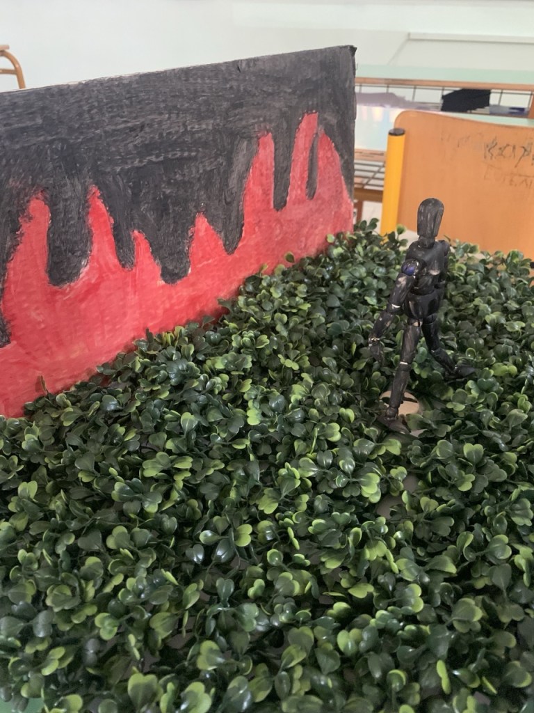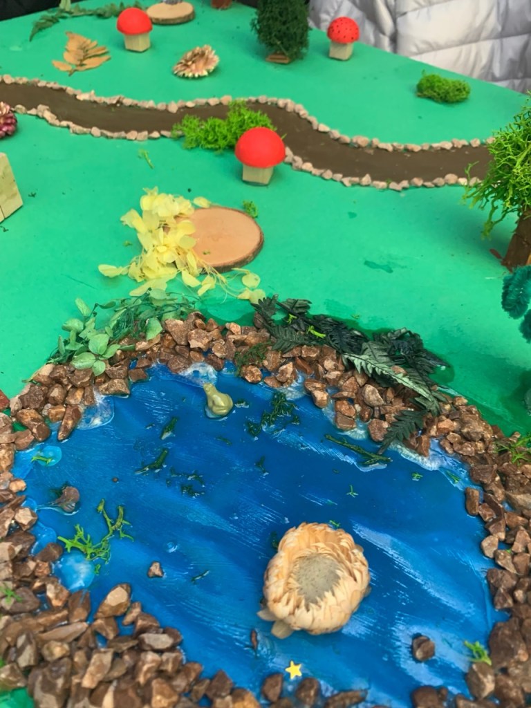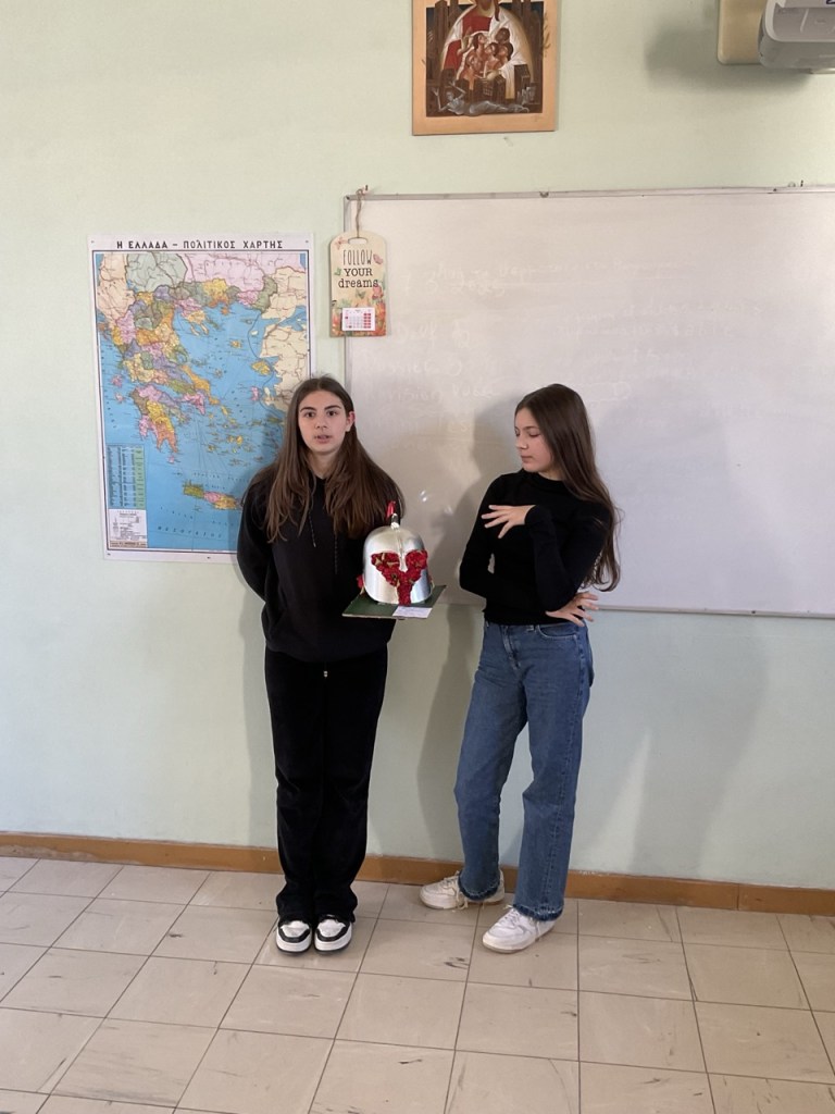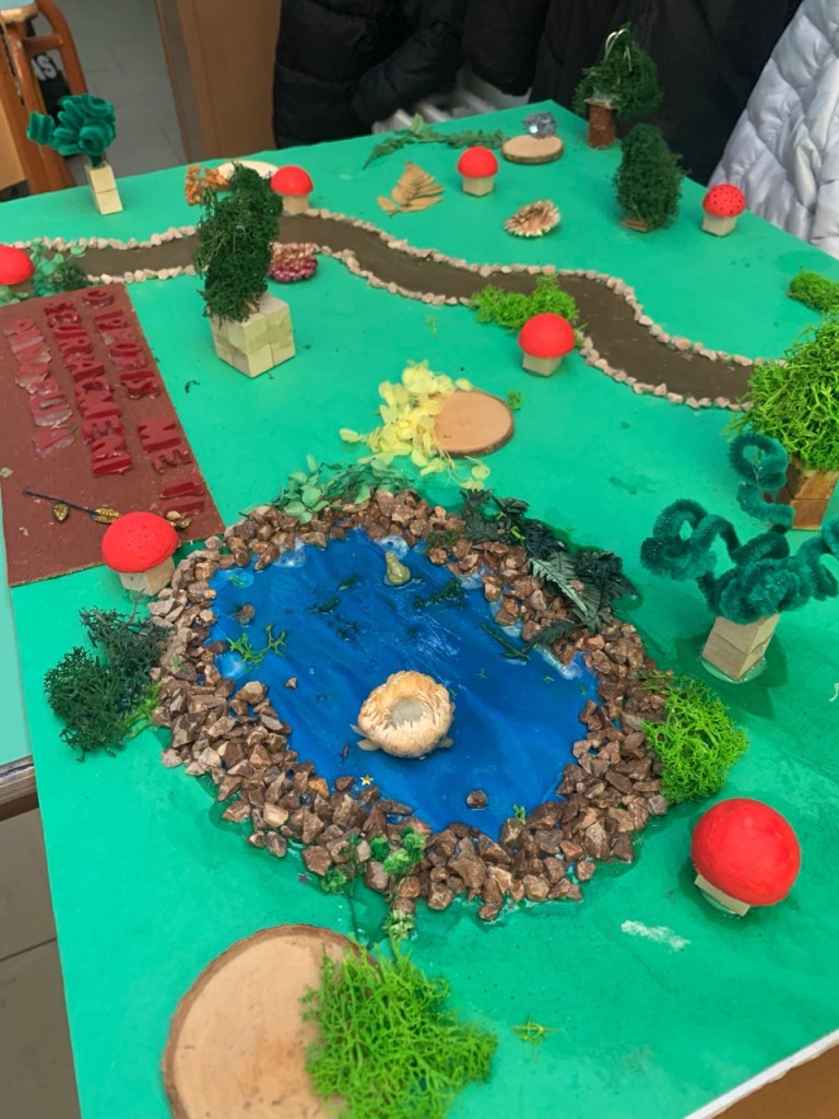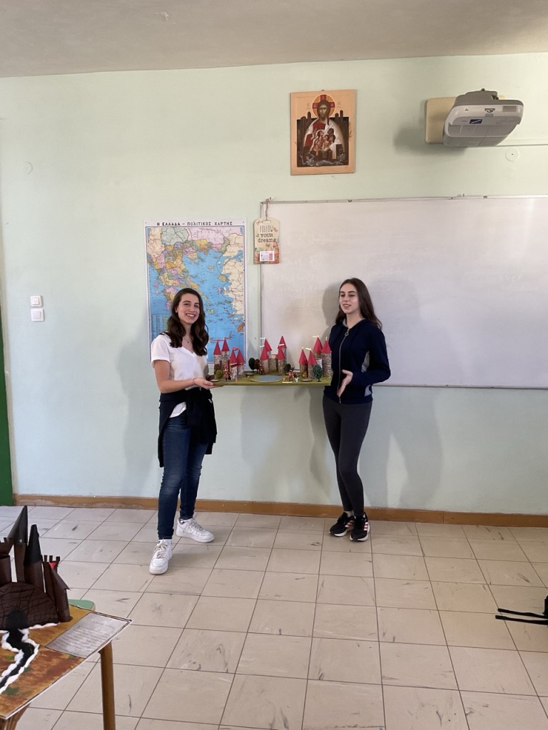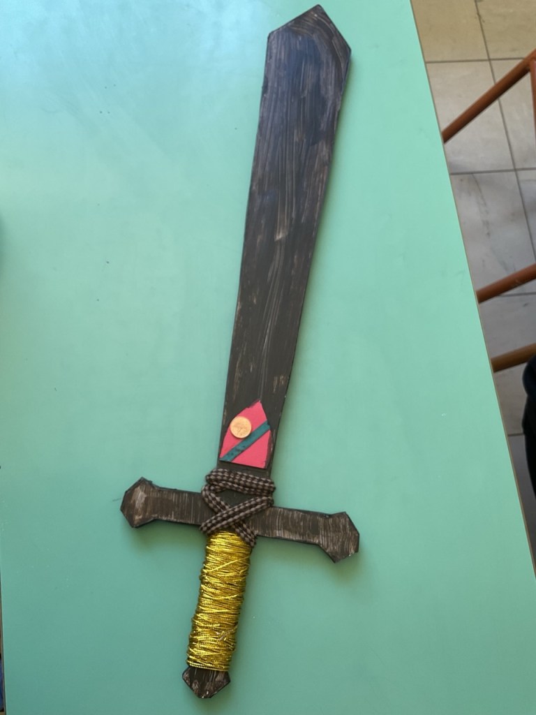 Δημιουργία κατασκευών και μακέτας: Κάθε ομάδα ανέλαβε να αποδώσει εικαστικά τη διαδρομή του ιππότη μέσα από μακέτα. Οι μαθητές αναπαρέστησαν με φαντασία και ακρίβεια τους σταθμούς του ταξιδιού: από το κάστρο μέχρι το τέλος της διαδρομής του ήρωα, με συμβολικά υλικά, κατασκευές και λεζάντες. Παράλληλα κατασκεύασαν το κράνος και το σπαθί του ιππότη.