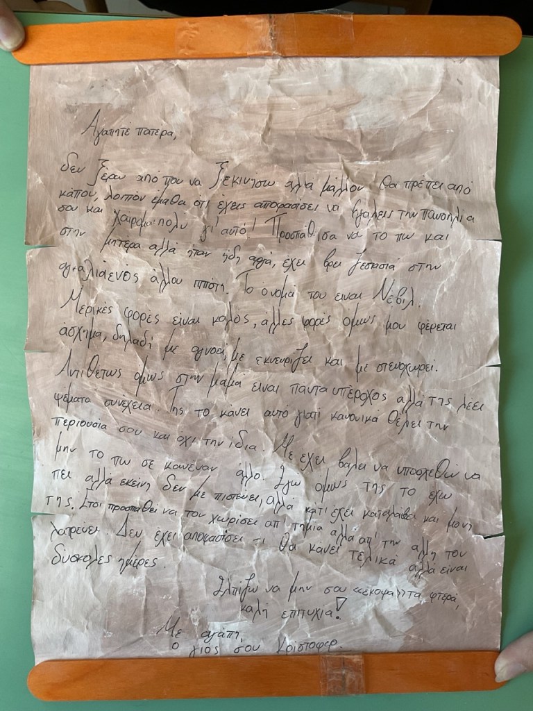 Το γράμμα που έλαβε ο ιππότης από τον γιο του: Μαθήτρια ανέλαβε να συντάξει το γράμμα που έλαβε ο ιππότης από τον γιο του, όπου του εξέφραζε το πικρό του παράπονο ότι λείπει πολύ στον ίδιο και τη μητέρα του.