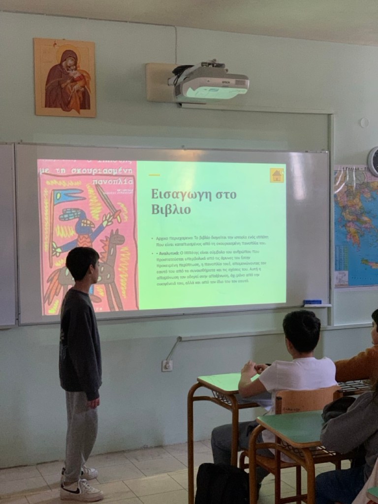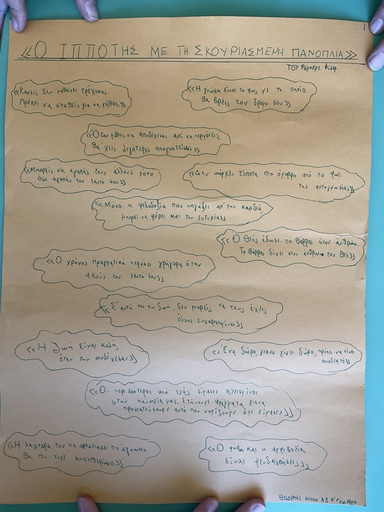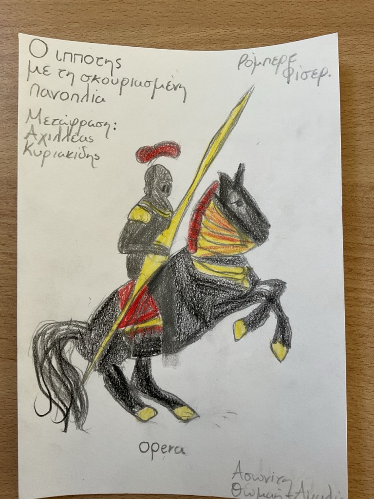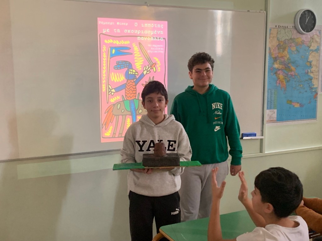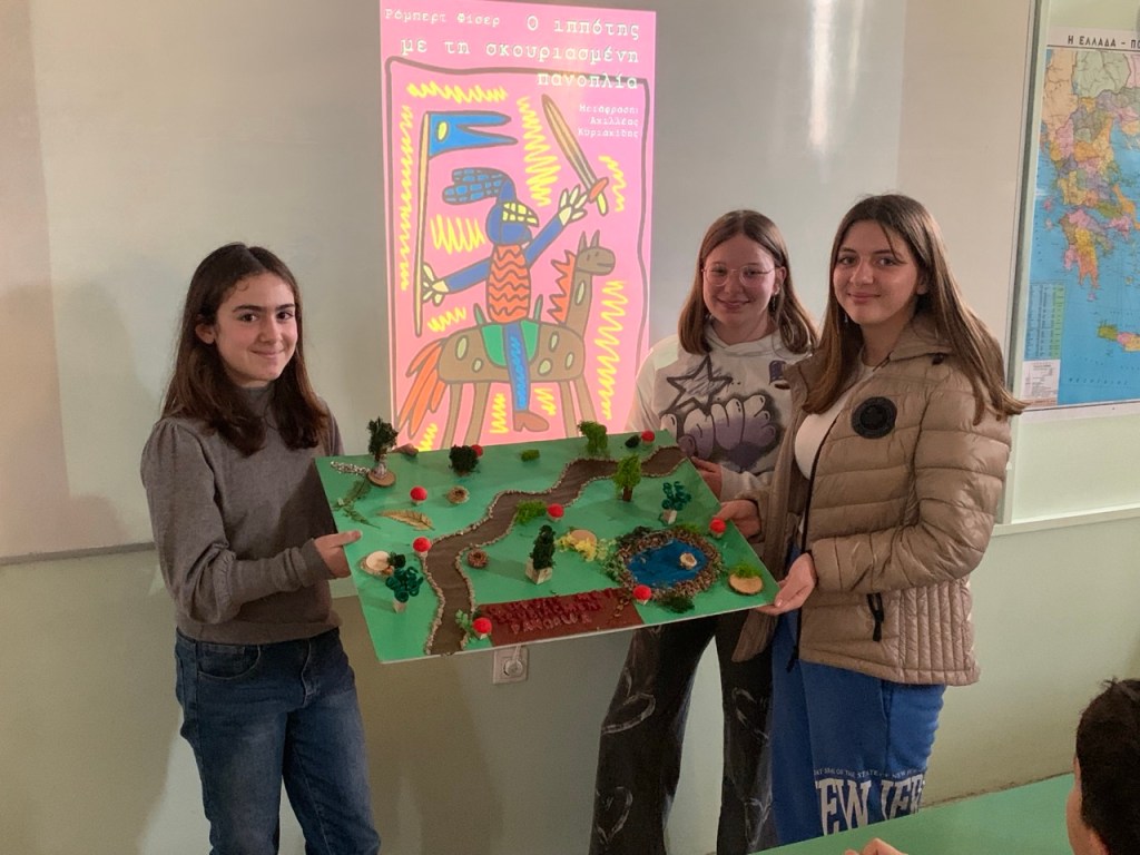 Όταν ανακοινώθηκε στους μαθητές και τις μαθήτριες των τμημάτων Α1 και Α2 ότι φέτος στο πλαίσιο του μαθήματος της Νεοελληνικής Λογοτεχνίας θα δουλέψουμε πάνω σε ένα ολόκληρο λογοτεχνικό βιβλίο στην τάξη, οι αντιδράσεις ήταν κάπως έτσι: «Τι είδους βιβλίο;», «Πόσες σελίδες θα είναι;», «Θα το διαβάσουμε ΟΛΟ;», «Θα είναι δύσκολο;». Η προσδοκία συνυπήρχε με μια παιδική αγωνία για το άγνωστο. Μετά από πολλή σκέψη και αναζήτηση καταλήξαμε στο βιβλίο του Ρόμπερτ Φίσερ, «Ο Ιππότης με τη Σκουριασμένη Πανοπλία». Επειδή ακριβώς είναι ένα βιβλίο που δεν διαβάζεται μόνο με το μυαλό, αλλά και με την καρδιά, ζητήθηκε από τα παιδιά να ακολουθήσουν όλα μαζί τον ιππότη σε ένα διαφορετικό ταξίδι. Όχι στον χάρτη, αλλά μέσα τους. Κι εκεί ξεκίνησαν όλα…