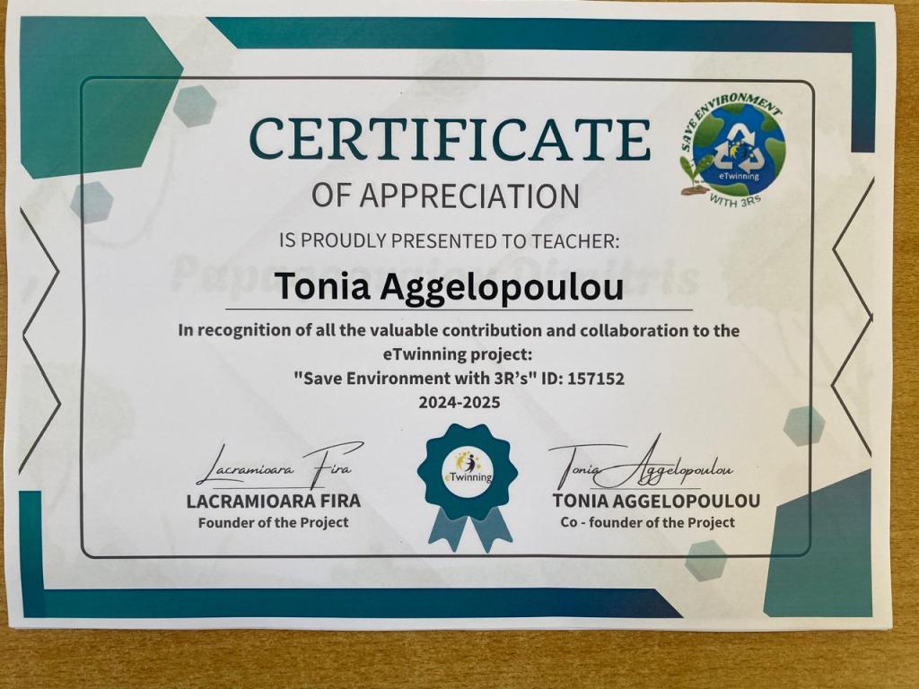 Οδεύοντας προς τη λήξη του project μας με τίτλο “Save environment with 3 Rs”, οι μαθητές της Γ’ Γυμνασίου του τμήματος της κ. Τ. Αγγελοπούλου συμμετείχαν στο τελευταίο online meeting με τους συνομήλικους συμμαθητές τους από τα ξένα σχολεία. Σε κλίμα ενθουσιασμού, οι μαθητές εξέφρασαν τη χαρά τους για την ολοκλήρωση του προγράμματος και την άψογη συνεργασία με τα παιδιά του εξωτερικού. Σε όλα τα παιδιά απονεμήθηκε το πιστοποιητικό “Certificate of Appreciation” για την επιτυχή υλοποίηση του project. Η όλη εμπειρία από τη συμμετοχή της τάξης μας στο e-Twinning ήταν μοναδική και πολύ ωφέλιμη, αφού οι μαθητές μας εμπλούτισαν τις γνώσεις τους σε περιβαλλοντικά θέματα και προβληματίστηκαν για το αύριο του πλανήτη μας, προτείνοντας βιώσιμες και εφικτές λύσεις. Το πιο σημαντικό όμως είναι ότι ήρθαν σε επαφή με παιδιά ξένων χωρών, μοιράστηκαν απόψεις και καλές πρακτικές και δημιούργησαν ενδιαφέρουσες εργασίες εξελίσσοντας τις ψηφιακές τους δεξιότητες και το επίπεδό τους στην αγγλική γλώσσα.