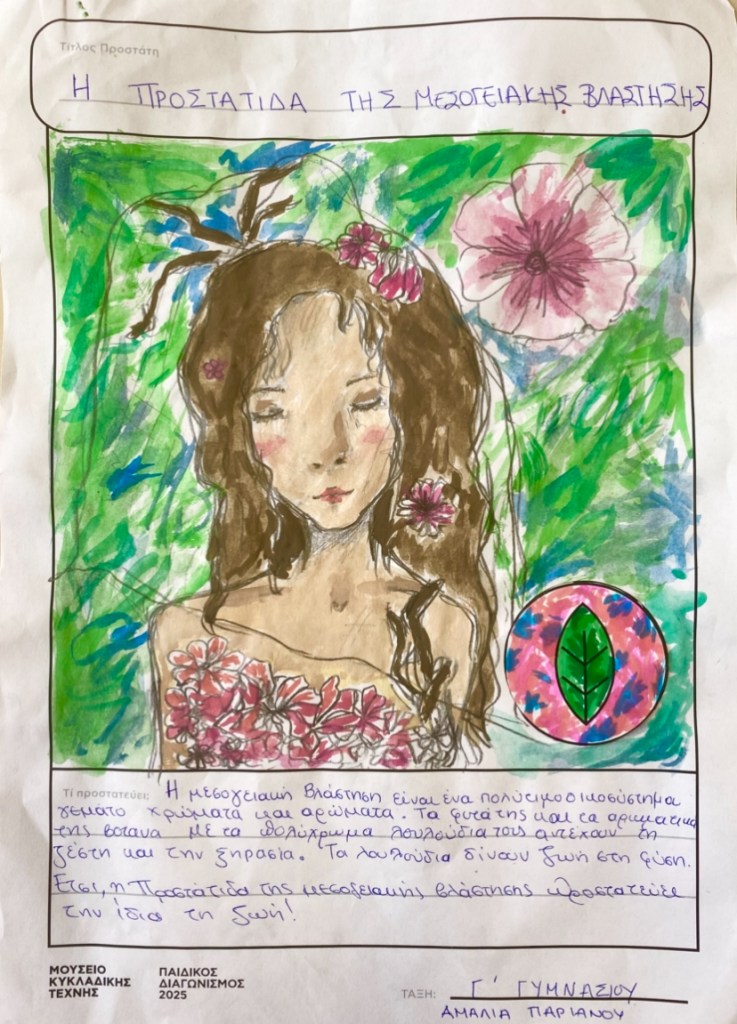 «Η μεσογειακή βλάστηση είναι ένα πολύτιμο οικοσύστημα γεμάτο χρώματα και αρώματα. Τα φυτά της και τα αρωματικά της βότανα με τα πολύχρωμα λουλούδια τους αντέχουν τη ζέστη και την ξηρασία. Τα λουλούδια δίνουν ζωή στη φύση, έτσι η προστάτιδα της μεσογειακής βλάστησης προστατεύει την ίδια τη ζωή.» Η συμμετοχή της μαθήτριας μας αποτελεί αφορμή για έμπνευση και προβληματισμό σχετικά με την ευθύνη που όλοι μας έχουμε για την προστασία του περιβάλλοντος και την αγάπη προς την τέχνη.