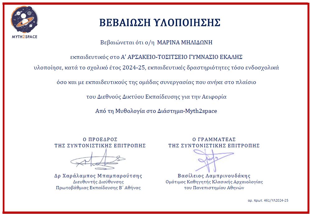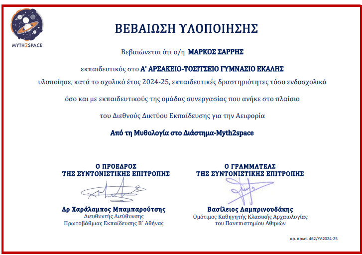 Οι εκπαιδευτικοί του Α΄ Αρσακείου-Τοσιτσείου Γυμνασίου Εκάλης κ. Μαρίνα Μηλιδώνη, φιλόλογος, και κ. Μάρκος Σαρρής, βιολόγος, υλοποίησαν, κατά το σχολικό έτος 2024-2025, εκπαιδευτικές δραστηριότητες τόσο ενδοσχολικά όσο και με συνεργαζόμενα σχολεία της Ροδόπης και της Αλεξανδρούπολης, στο πλαίσιο του Διεθνούς Δικτύου Εκπαίδευσης για την Αειφορία Από τη Μυθολογία στο Διάστημα.