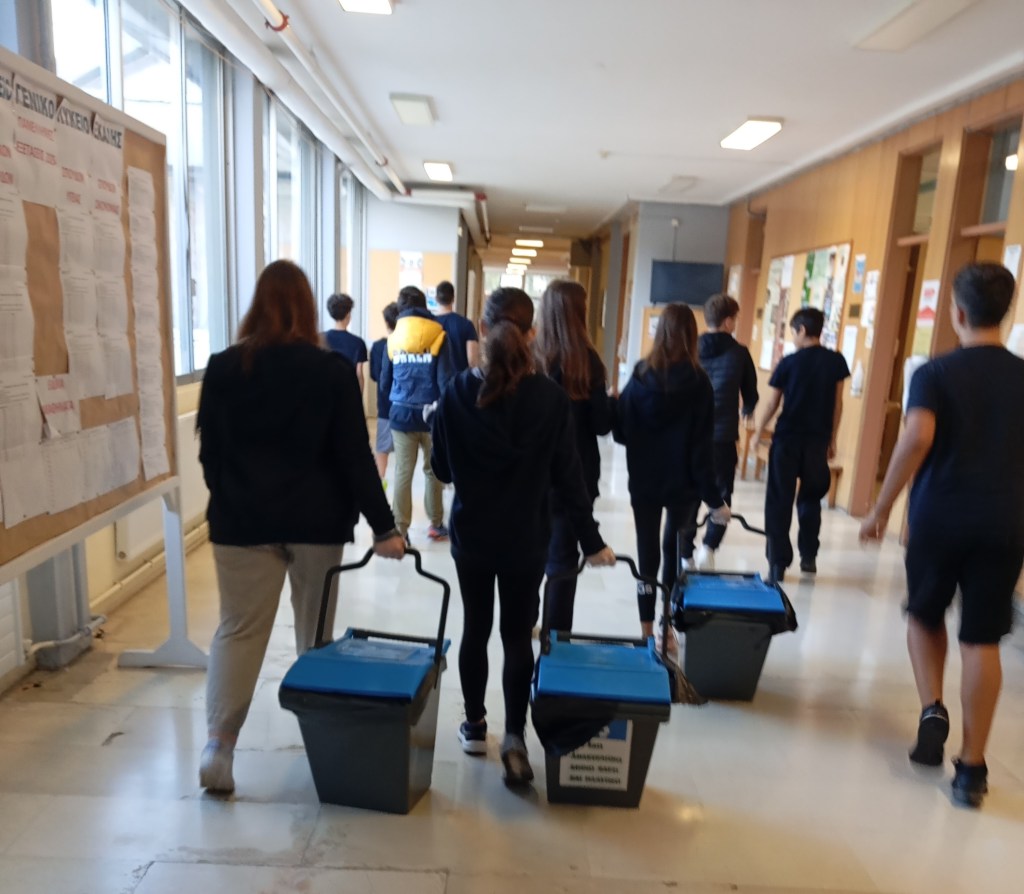 Συλλογή και Μεταφορά Ανακυκλώσιμων Υλικών: Σε τακτά χρονικά διαστήματα η ομάδα Ecolab αναλαμβάνει τη συλλογή των υλικών από τους εσωτερικούς κάδους και τη μεταφορά τους στους μπλε κάδους που έχει τοποθετήσει ο Δήμος στον προαύλιο χώρο του σχολείου. Η διαδικασία γίνεται με τάξη, ασφάλεια και υπευθυνότητα, με τους μαθητές να μεταφέρουν τους κάδους και να φορούν γάντια.