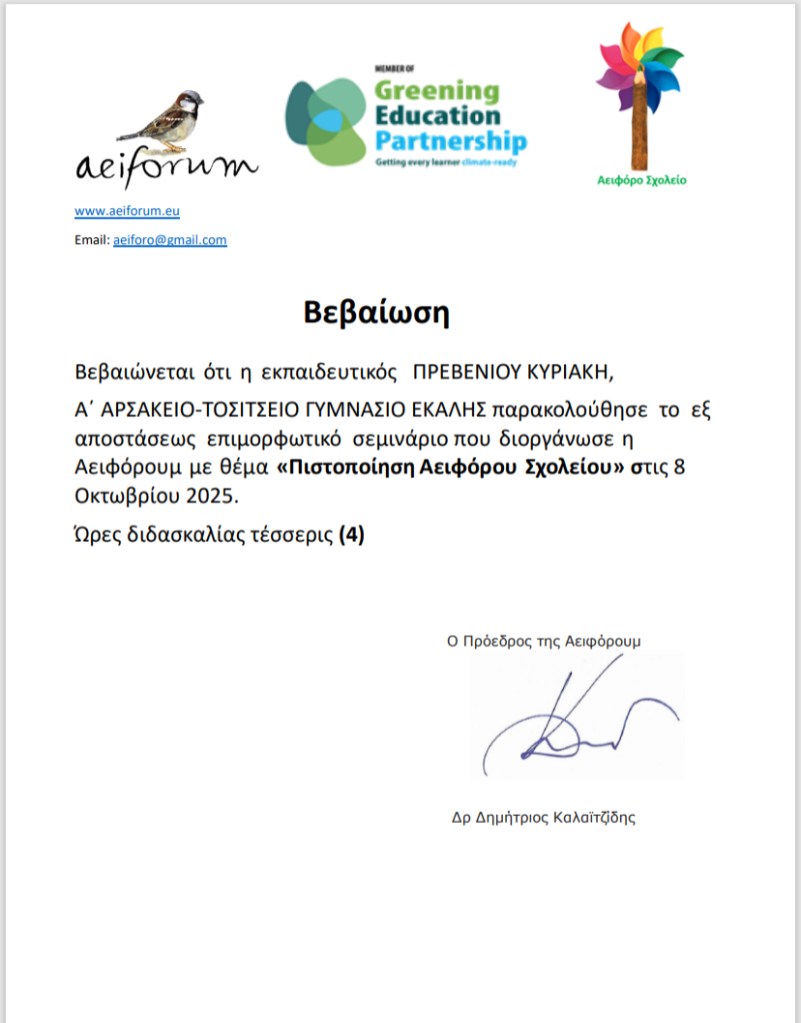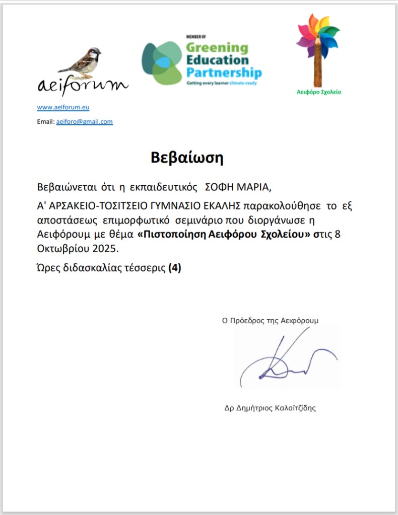 Στο πλαίσιο της συνεχούς προσπάθειας για την προώθηση της περιβαλλοντικής εκπαίδευσης και της βιώσιμης ανάπτυξης, το Σχολείο μας συμμετείχε στην επιμορφωτική διαδικτυακή επιμορφωτική συνάντηση που πραγματοποιήθηκε την Τετάρτη 8 Οκτωβρίου 2025, με θέμα την Πιστοποίηση Αειφόρου Σχολείου. Η εκδήλωση διοργανώθηκε από την Παιδαγωγική Ομάδα του Aeiforum και στόχος της ήταν η ενημέρωση και επιμόρφωση των εκπαιδευτικών σχετικά με το νέο πλαίσιο που διαμορφώνεται στην εκπαίδευση για την αειφορία και την αντιμετώπιση της κλιματικής αλλαγής. Κατά τη διάρκεια της επιμόρφωσης παρουσιάστηκαν οι σύγχρονες εξελίξεις στην εκπαιδευτική πολιτική που σχετίζονται με την αειφορία, καθώς και οι βασικοί άξονες του προγράμματος Greening Education Partnership. Ιδιαίτερη έμφαση δόθηκε στους δείκτες Αειφόρου Σχολείου τόσο για το Δημοτικό, για το Νηπιαγωγείο, όσο και για τη Δευτεροβάθμια εκπαίδευση, καθώς και στην αξιοποίησή τους ως εργαλείο σχεδιασμού και αξιολόγησης εκπαιδευτικών δράσεων. Παρουσιάστηκαν επίσης το Ημερολόγιο Αειφόρου Σχολείου και πρακτικοί τρόποι με τους οποίους οι σχολικές μονάδες μπορούν να ενσωματώνουν και να ενοποιούν διαφορετικές δράσεις σε ένα ολοκληρωμένο Σχέδιο Δράσης, ενισχύοντας έτσι τον παιδαγωγικό τους ρόλο και τον κοινωνικό τους αντίκτυπο. Το Σχολείο μας εκπροσωπήθηκε στην επιμόρφωση από τις καθηγήτριες Τεχνολογίας κ. Μαρία Σόφη και Καλλιτεχνικών κ. Κυριακή Πρεβενιού, οι οποίες παρακολούθησαν με ιδιαίτερο ενδιαφέρον τις εισηγήσεις και τις παρουσιάσεις, εμπλούτισαν τις γνώσεις τους πάνω σε ζητήματα αειφορίας και περιβαλλοντικής εκπαίδευσης και έλαβαν βεβαίωση παρακολούθησης της επιμόρφωσης. Η συμμετοχή στην παραπάνω δράση αποτελεί σημαντικό βήμα για την υλοποίηση του οράματος του Σχολείου μας να αποτελέσει έναν χώρο μάθησης που καλλιεργεί περιβαλλοντική συνείδηση, υπευθυνότητα και ενεργό στάση ζωής στους μαθητές, συμβάλλοντας με ουσιαστικό τρόπο στη διαμόρφωση ενός βιώσιμου μέλλοντος για όλους.