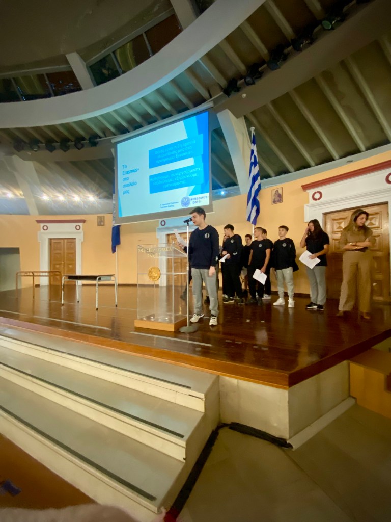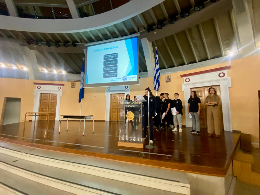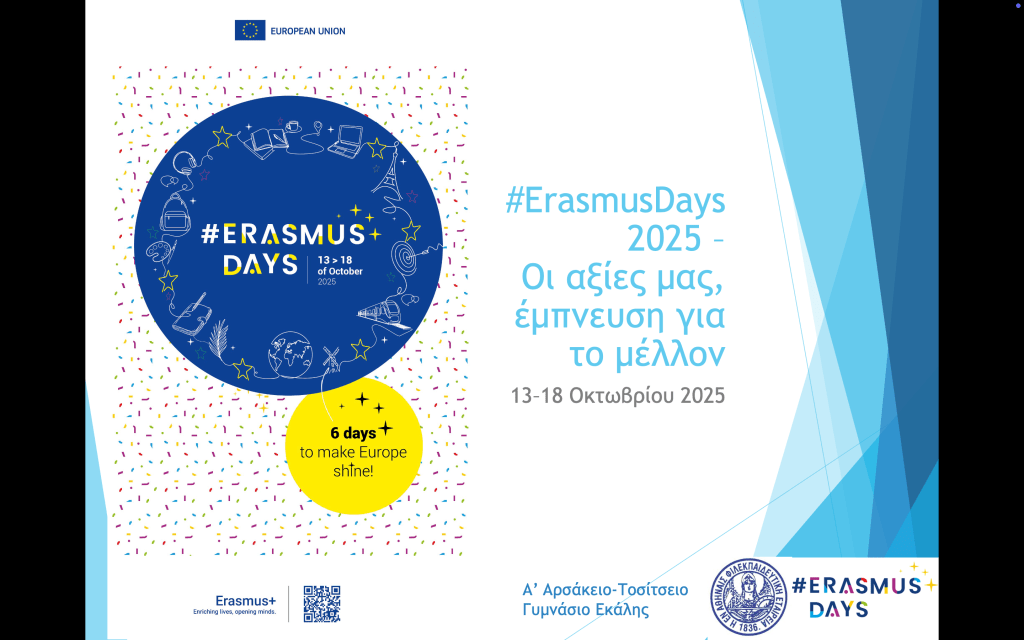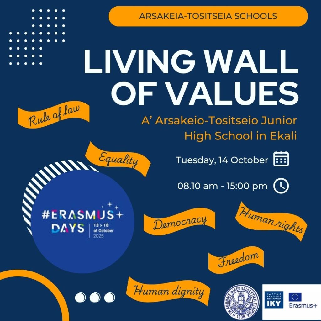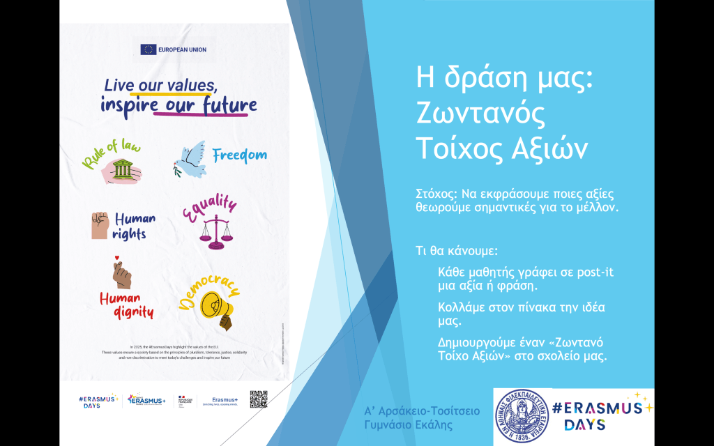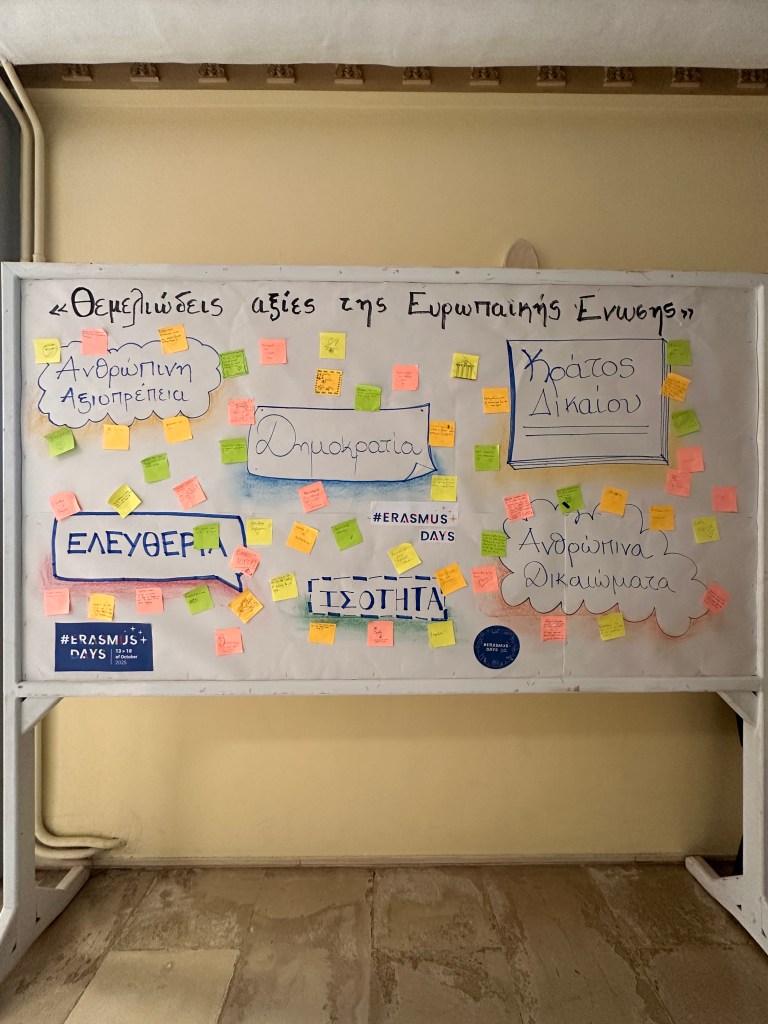 Στο πλαίσιο των ErasmusDays 2025 και με κεντρικό θέμα «Οι αξίες μας, έμπνευση για το μέλλον», πραγματοποιήθηκε στο σχολείο μας η δράση «Ζωντανός Τοίχος Αξιών». Η ημέρα ξεκίνησε με ενημέρωση των μαθητών κατά την πρωινή προσευχή, όπου παρουσιάστηκε τι είναι οι ErasmusDays καθώς και ποια θα είναι η φετινή συμμετοχή του σχολείου μας στο πλαίσιο του προγράμματος Erasmus+. Στη συνέχεια, οι μαθητές κλήθηκαν να συμμετάσχουν στη δράση, η οποία πραγματοποιήθηκε σε κεντρικό διάδρομο του σχολείου. Εκεί είχε τοποθετηθεί ένα ειδικό ταμπλό, αφιερωμένο στις έξι θεμελιώδεις αξίες της Ευρωπαϊκής Ένωσης: Ανθρώπινη Αξιοπρέπεια, Ελευθερία, Δημοκρατία, Ισότητα, Κράτος Δικαίου και Ανθρώπινα Δικαιώματα. Οι μαθητές έγραψαν σε χρωματιστά χαρτάκια τις δικές τους σκέψεις, ιδέες ή φράσεις που αποτυπώνουν τις αξίες αυτές, δημιουργώντας έναν πολύχρωμο και συμβολικό «Ζωντανό Τοίχο Αξιών» – μια δημιουργική συλλογική απεικόνιση των αξιών που μας ενώνουν ως Ευρωπαίους πολίτες. Η δράση πραγματοποιήθηκε με την επιμέλεια και καθοδήγηση της κ. Μ. Στούπα, καθηγήτριας Αγγλικών και υπεύθυνης του προγράμματος Erasmus+, ενώ την καλλιτεχνική επιμέλεια του ταμπλό είχε η κ. Κ. Πρεβενιού, καθηγήτρια Καλλιτεχνικών.