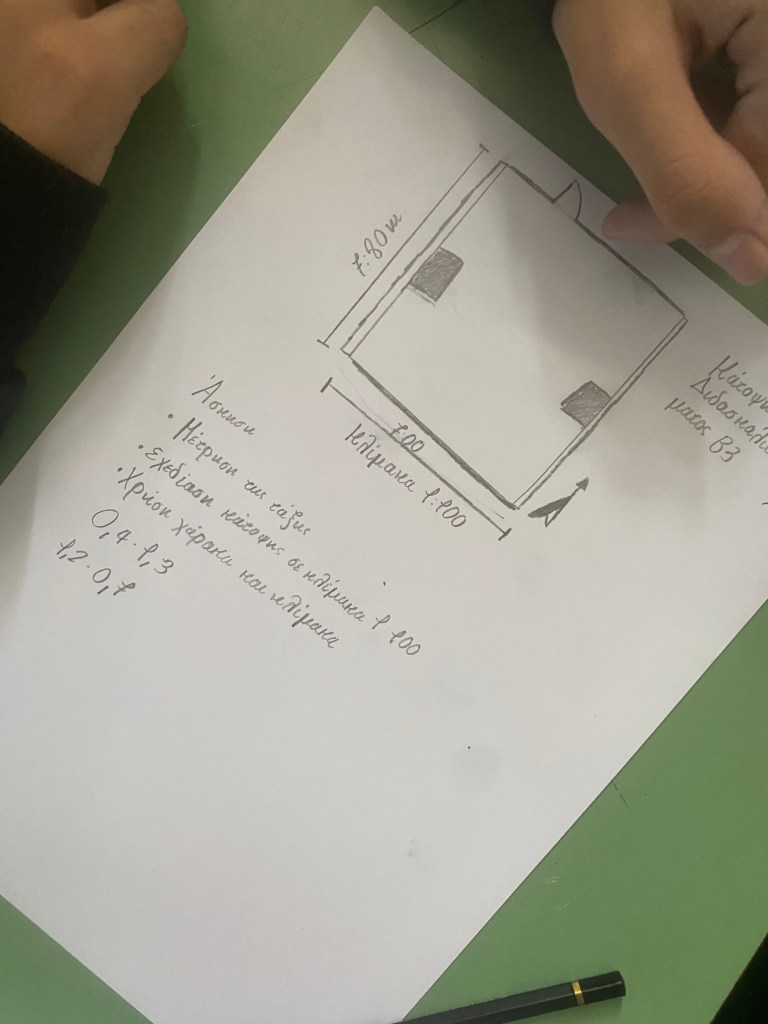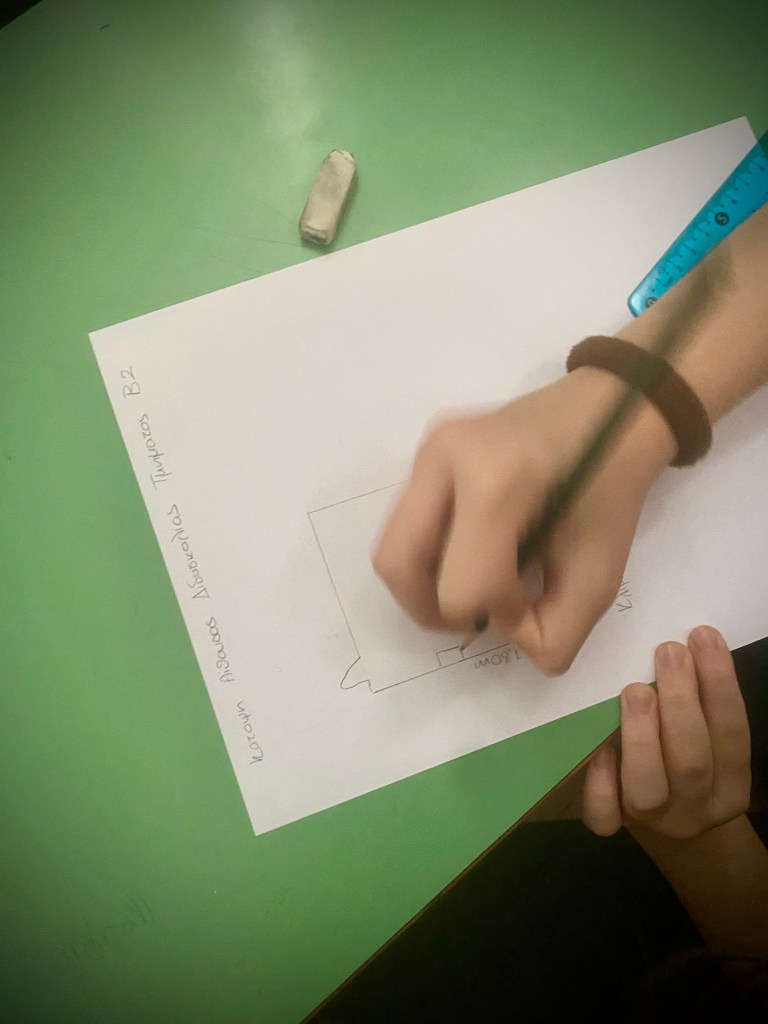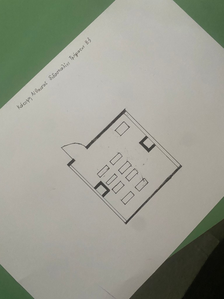 - Δεύτερη άσκηση: Σχεδίαση σε κάτοψη της αίθουσας διδασκαλίας, σε κλίμακα 1:100, ασκώντας την παρατηρητικότητα, την ακρίβεια και τη γεωμετρική σκέψη.