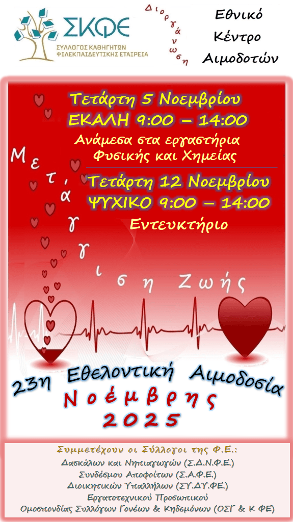 Την Τετάρτη 5 Νοεμβρίου 2025, τα Αρσάκεια–Τοσίτσεια Εκάλης φιλοξένησαν την 23η Εθελοντική Αιμοδοσία του Σ.Κ.Φ.Ε., μια δράση που έχει πλέον καθιερωθεί ως σημείο αναφοράς για την κοινωνική προσφορά της σχολικής μας κοινότητας. Η φετινή αιμοδοσία ολοκληρώθηκε με επιτυχία, χάρη στη συμμετοχή γονέων, εκπαιδευτικών και μελών του προσωπικού, αλλά και χάρη στη συντονισμένη συνεργασία των Διευθύνσεων όλων των σχολικών μονάδων της Εκάλης. Η δράση πραγματοποιήθηκε σε συνεργασία με το Εθνικό Κέντρο Αιμοδοτών (ΕΚΕΑ) και την Υπηρεσία Αιμοδοσίας του Γενικού και Ογκολογικού Νοσοκομείου Κηφισιάς “Οι Άγιοι Ανάργυροι”, που για ακόμη μία χρονιά στήριξαν με επαγγελματισμό και συνέπεια την προσπάθεια του Συλλόγου Καθηγητών της Φιλεκπαιδευτικής Εταιρείας (Σ.Κ.Φ.Ε.).
